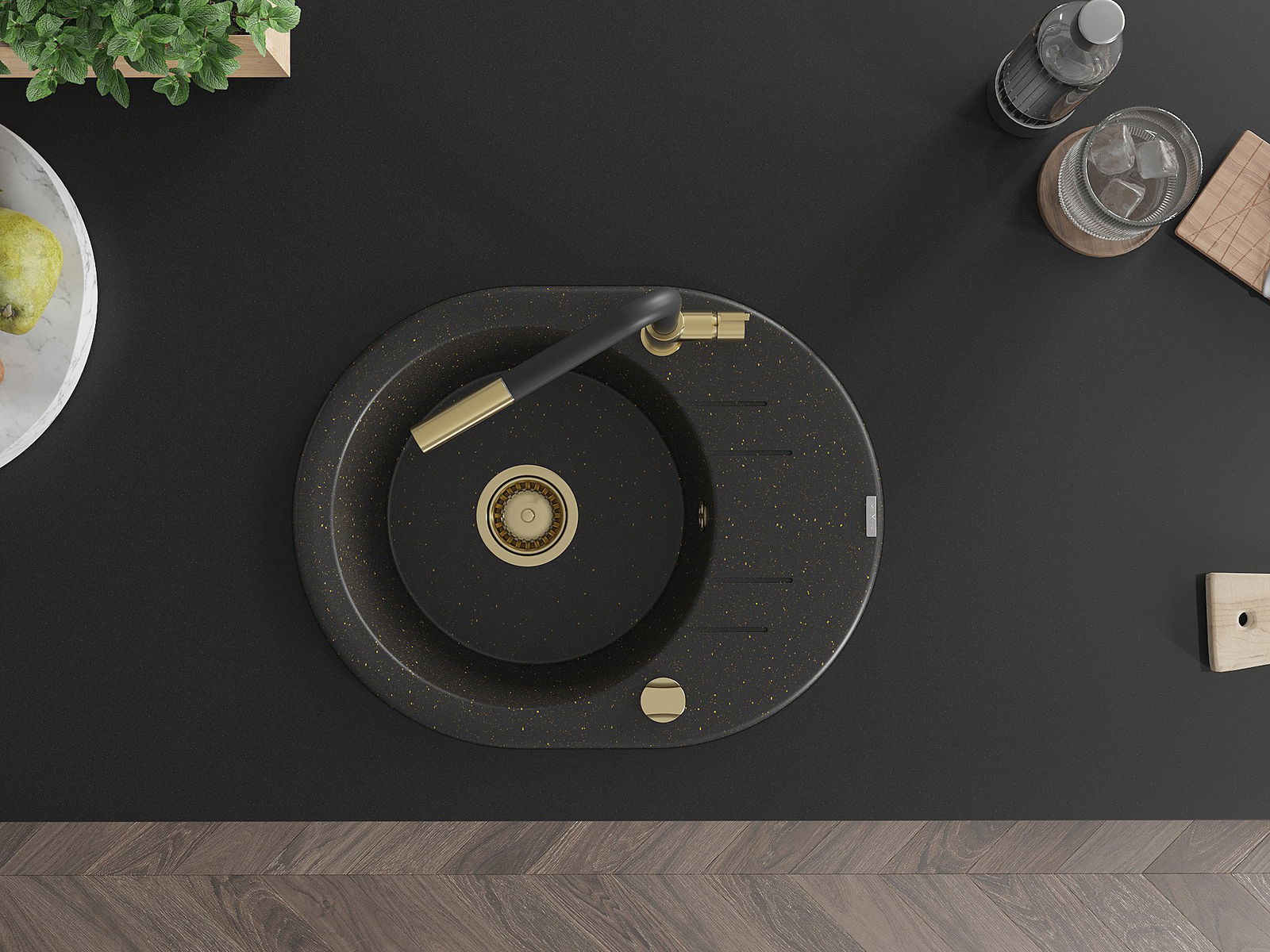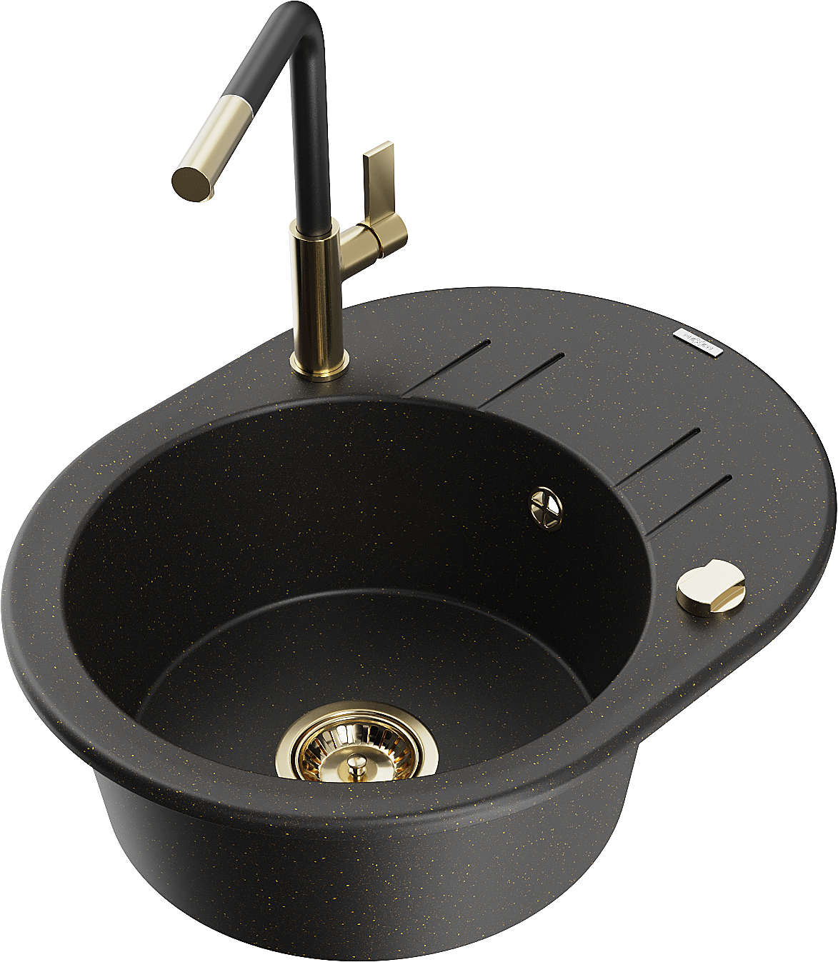 Mexen Kevin granitový kuchynský drez s 1 komorou, odkvapkávacou plochou a kuchynskou batériou Flora, čierny/zlatý