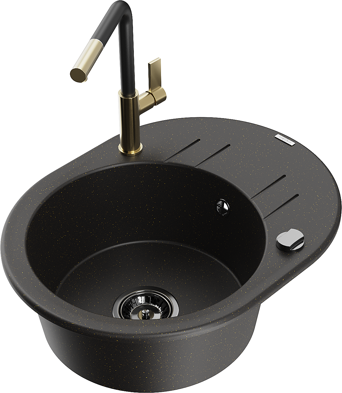 Mexen Kevin jednokomorový granitový drez s odkvapkávačom a kuchynskou batériou Flora, čierna/zlatý metalik