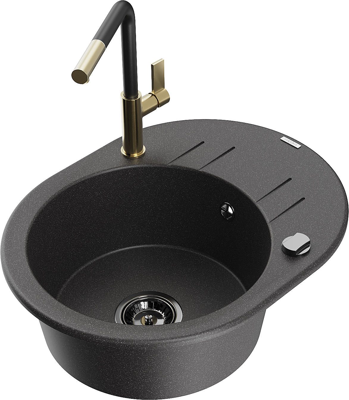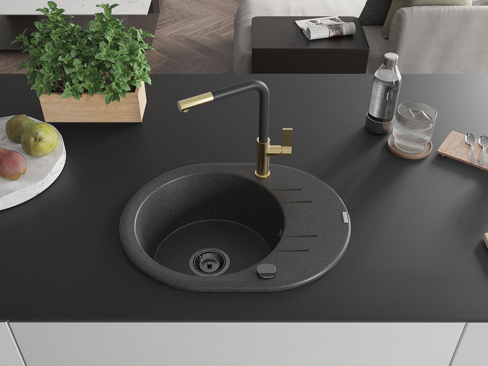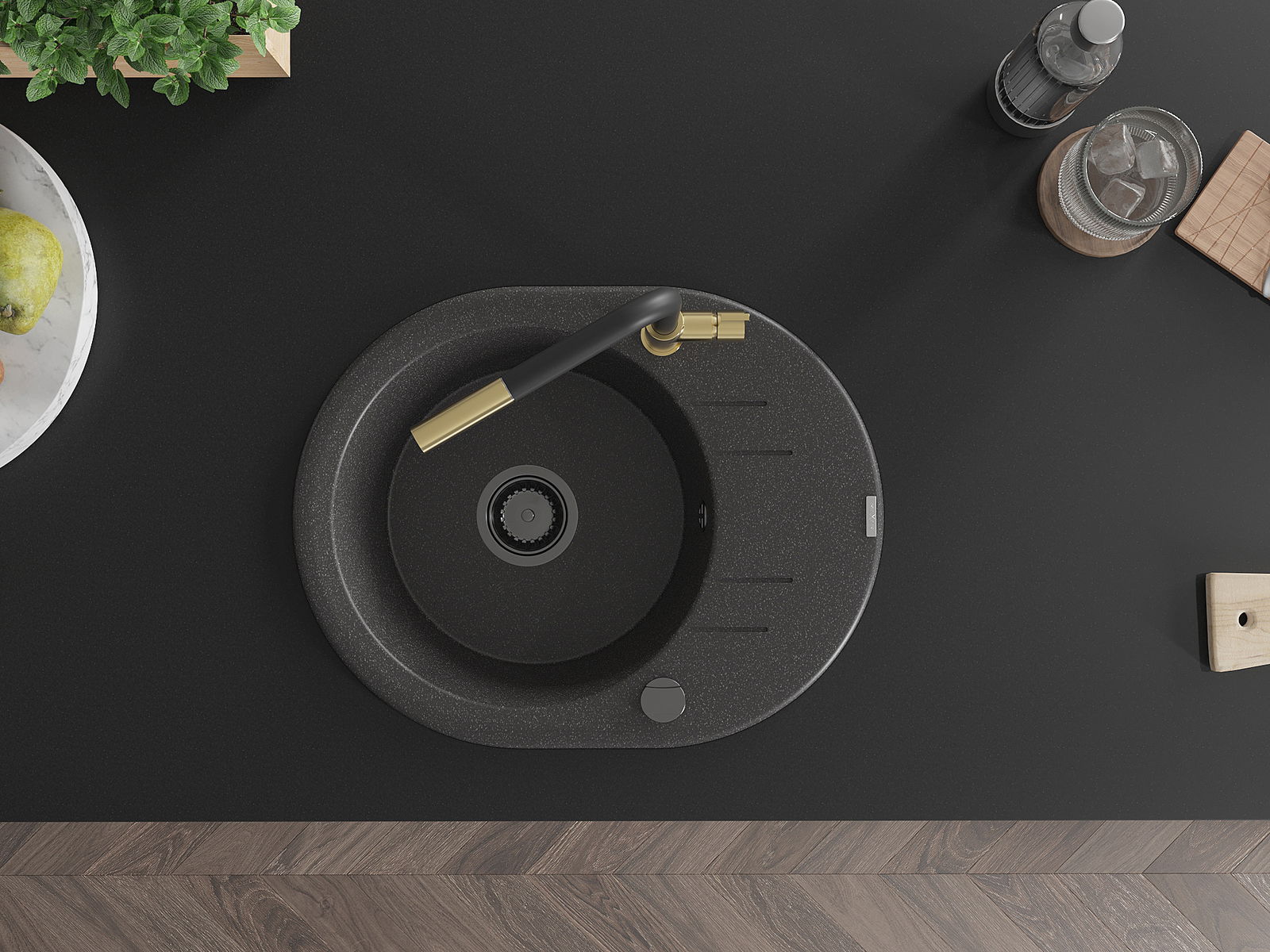 Mexen Kevin jednokomorový žulový drez s odkvapkávačom a kuchynským kohútikom Flora, čierny s postriekaním