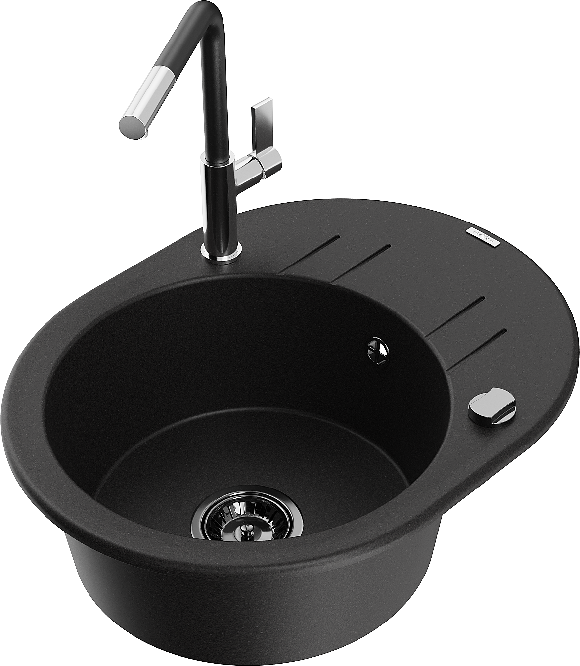 Mexen Kevin žulový kuchynský drez 1-komorový s odkvapkávačom a kuchynskou batériou Flora, čierny - 6517-77-670401-07-B