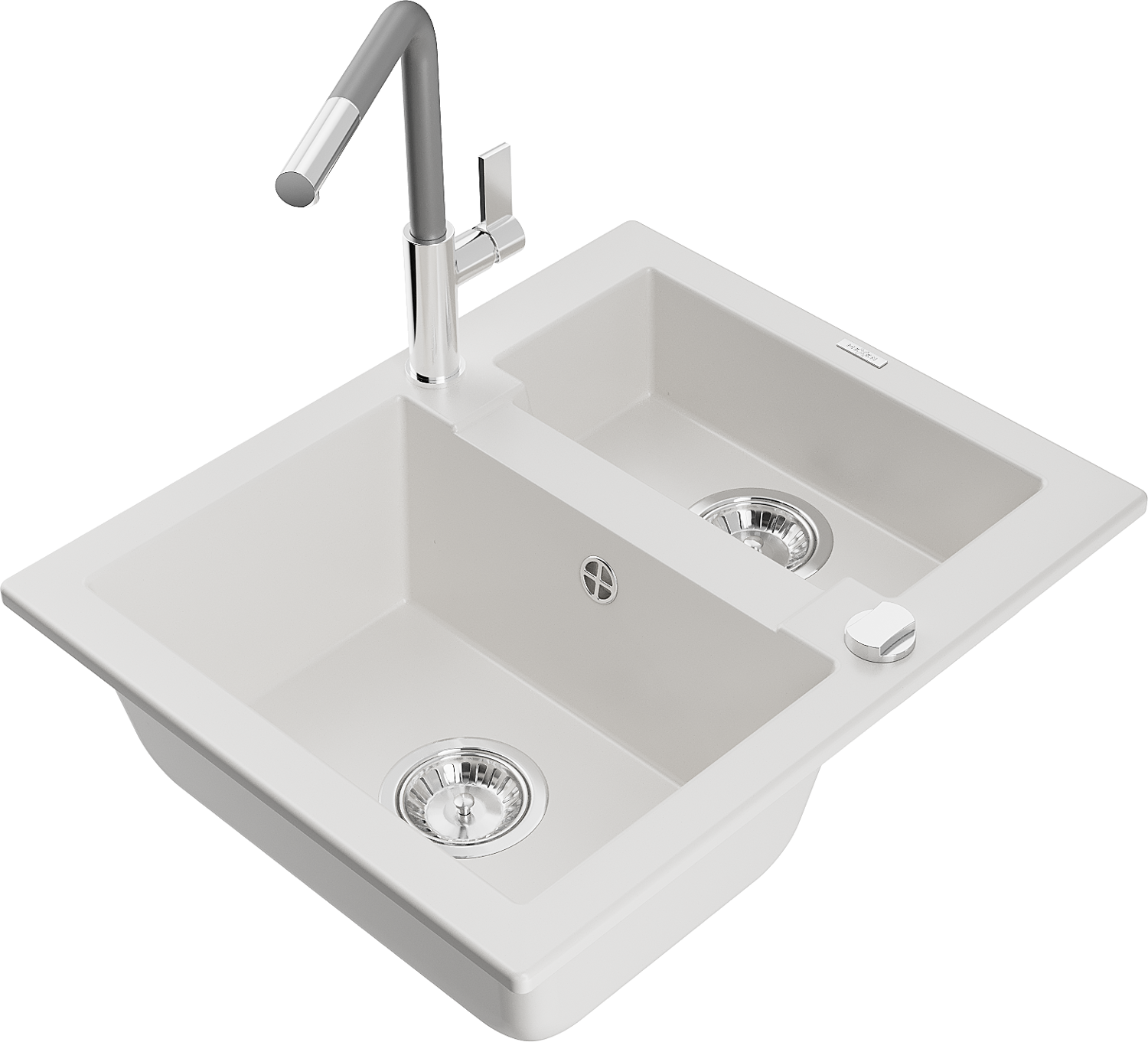 Mexen Carlos 1,5-komorový žulový drez s kuchynskou batériou Flora, biela - 6518-20-670401-06