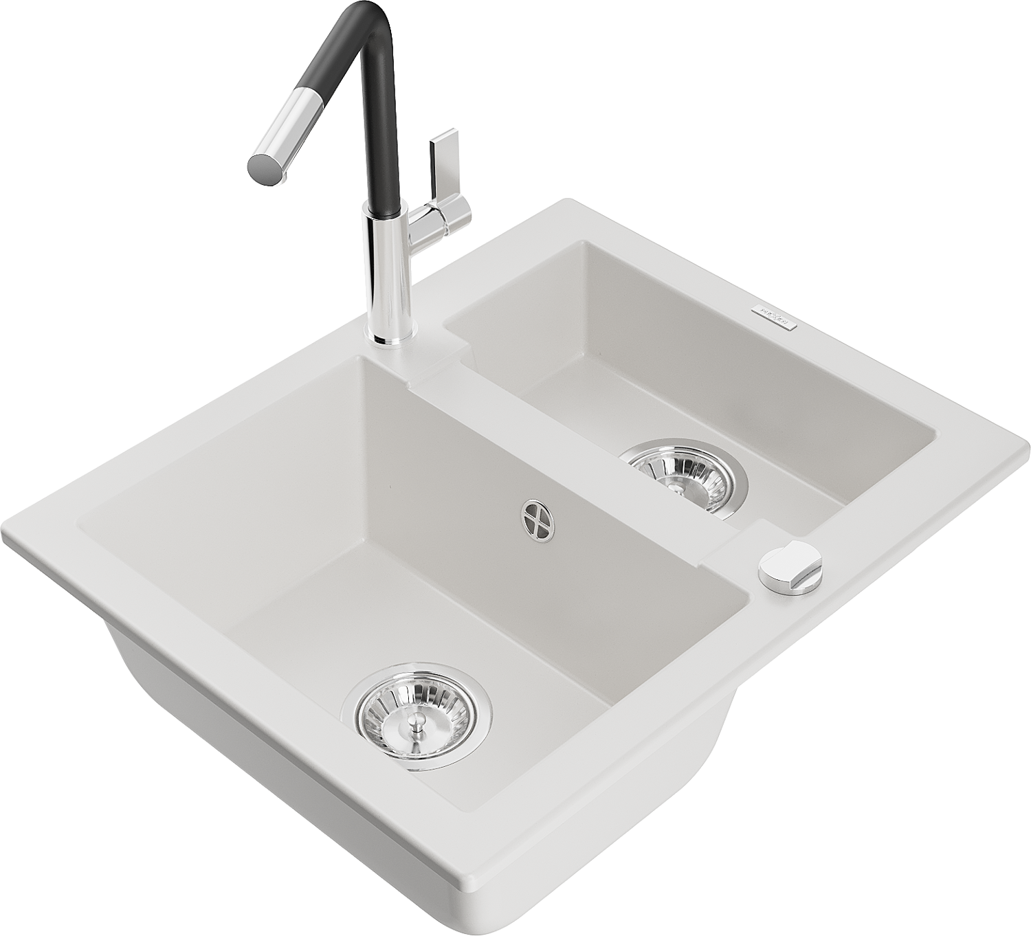 Mexen Carlos žulový drez 1,5-komorový s kuchynskou batériou Flora, biely - 6518-20-670401-07