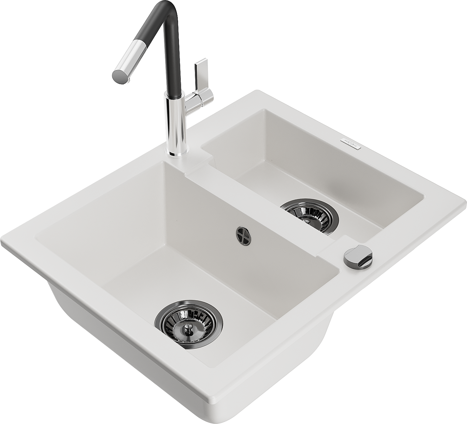 Mexen Carlos žulový kuchynský drez 1,5 komorový s kuchynskou batériou Flora, biely - 6518-20-670401-07-B