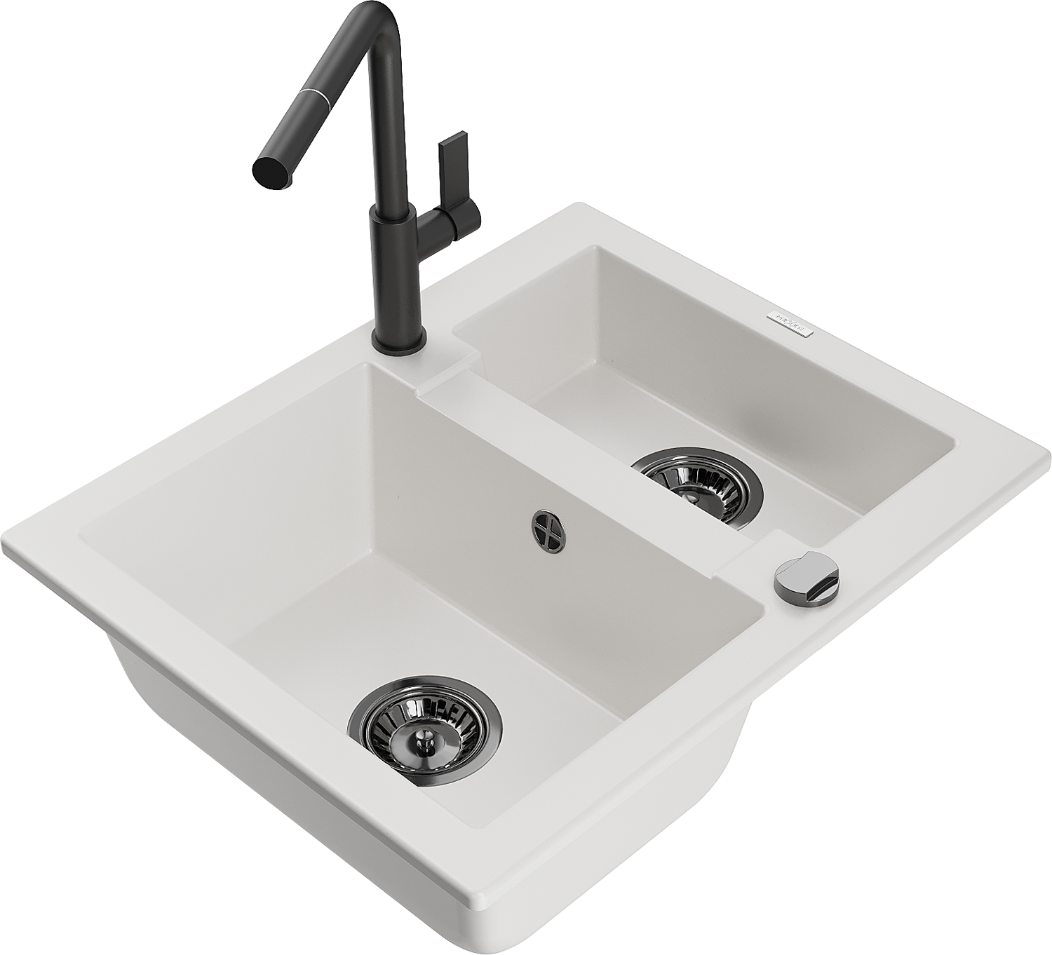 Mexen Carlos žulový drez s 1,5 komorami s kuchynskou batériou Flora, biely - 6518-20-670401-70-B