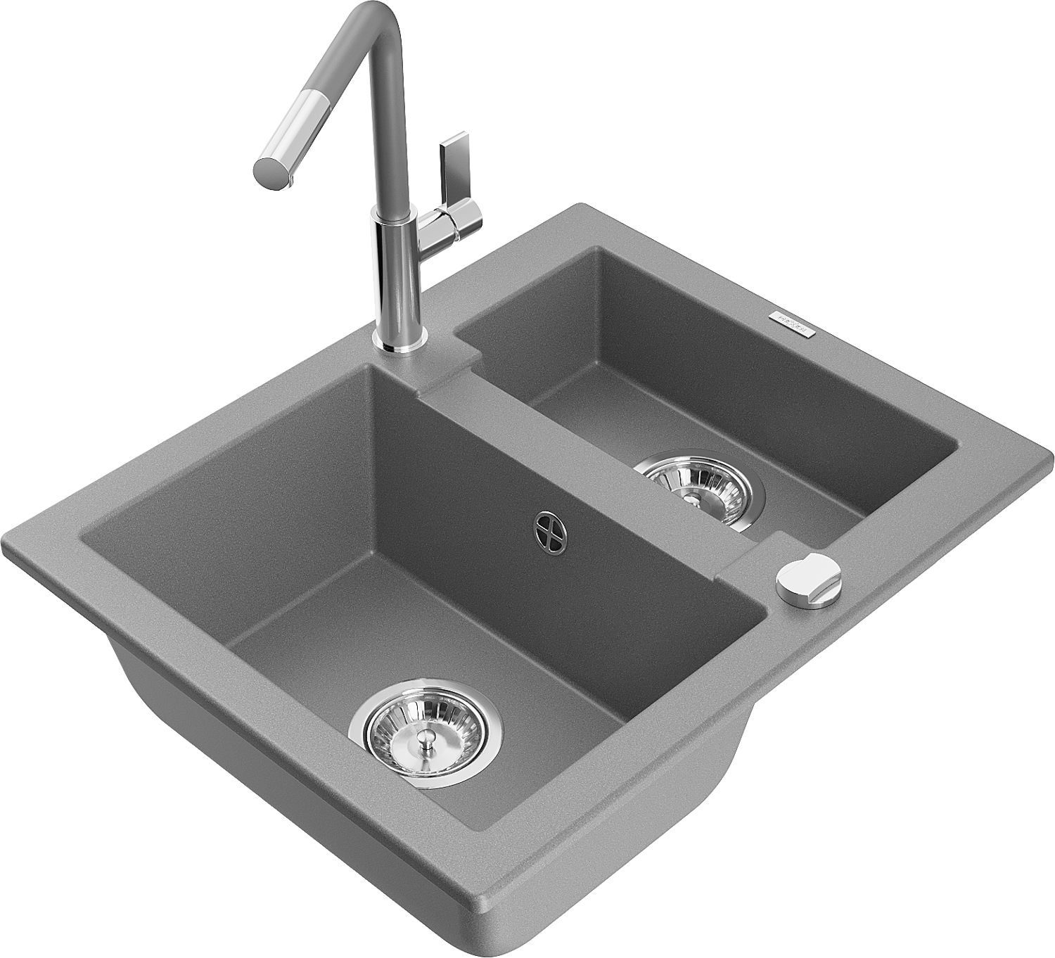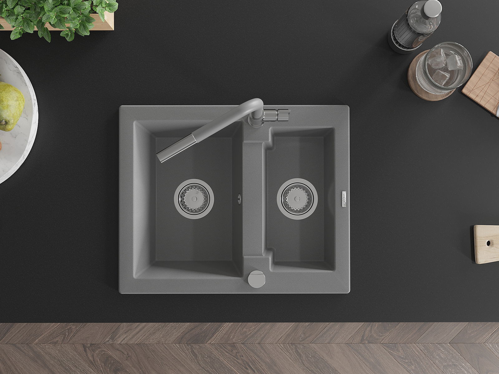 Mexen Carlos granitový kuchynský drez 1,5-komorový s kuchynskou batériou Flora, sivý - 6518-71-670401-06