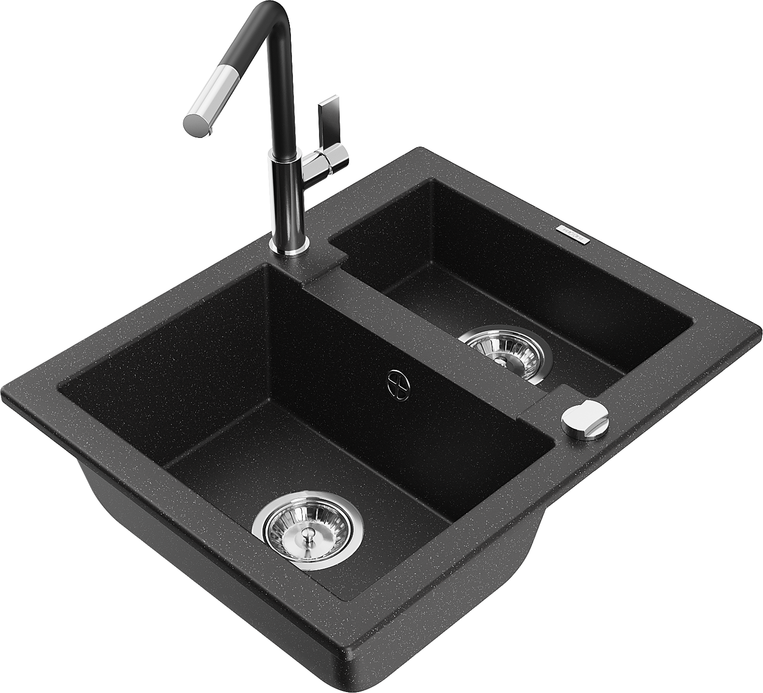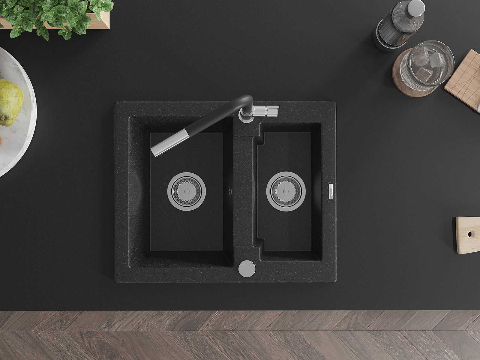 Mexen Carlos granitový drez 1,5-komorový s kuchynskou batériou Flora, čierny/strieborný metalik - 6518-73-670401-07