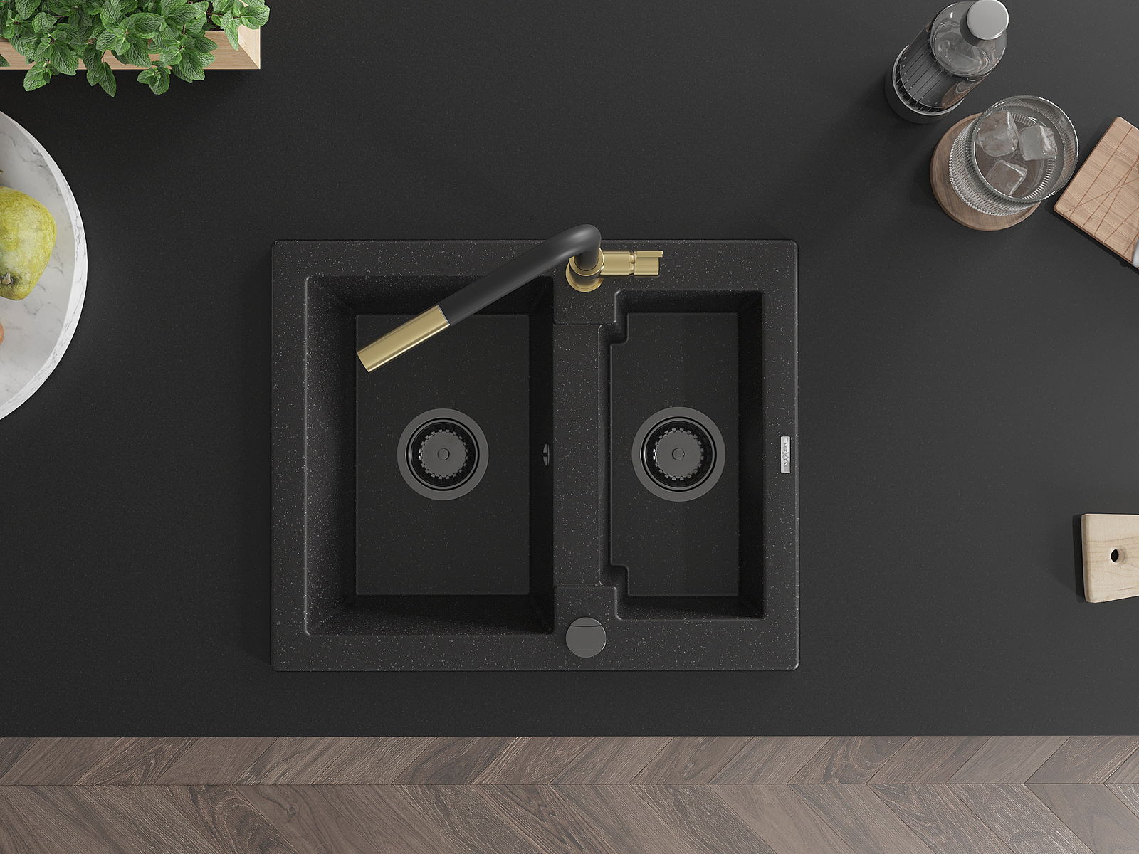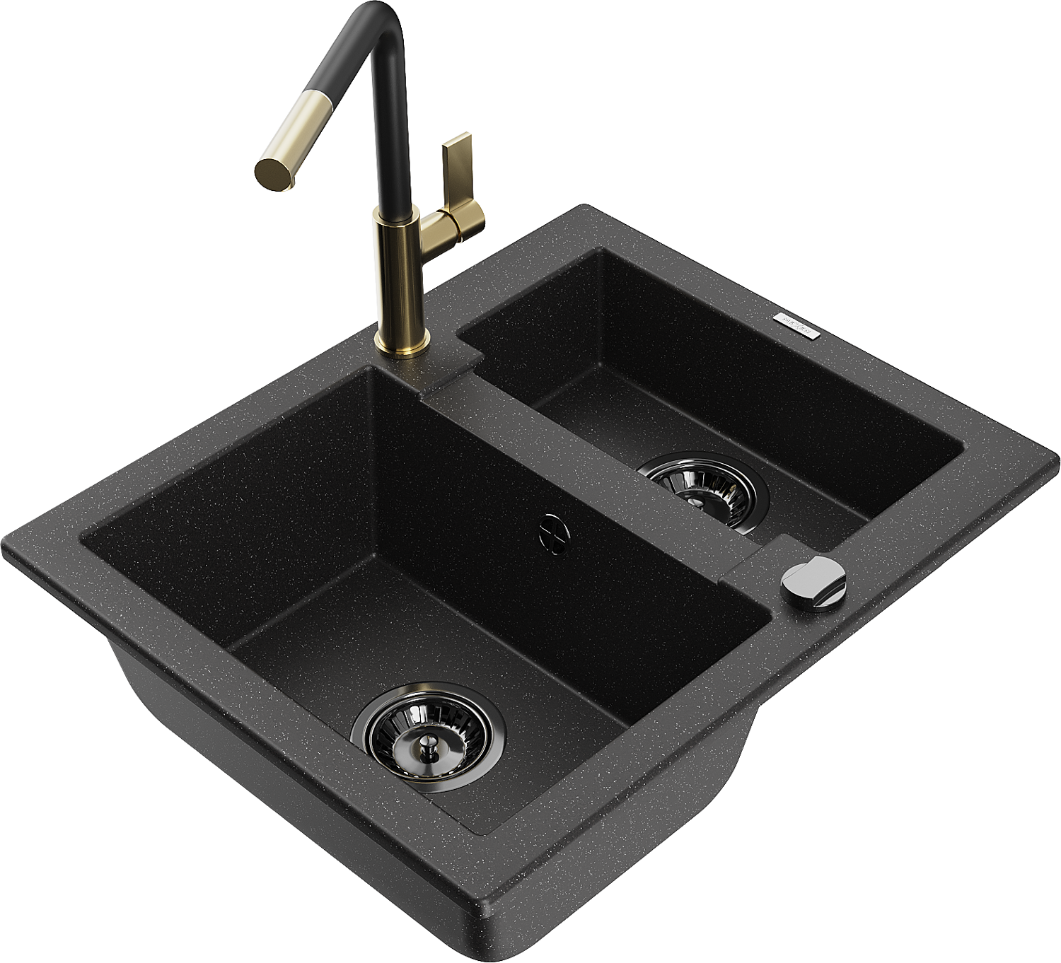 Mexen Carlos granitový drez 1,5-komorový s kuchynskou batériou Flora, čierny/strieborný metalický - 6518-73-670401-57-B