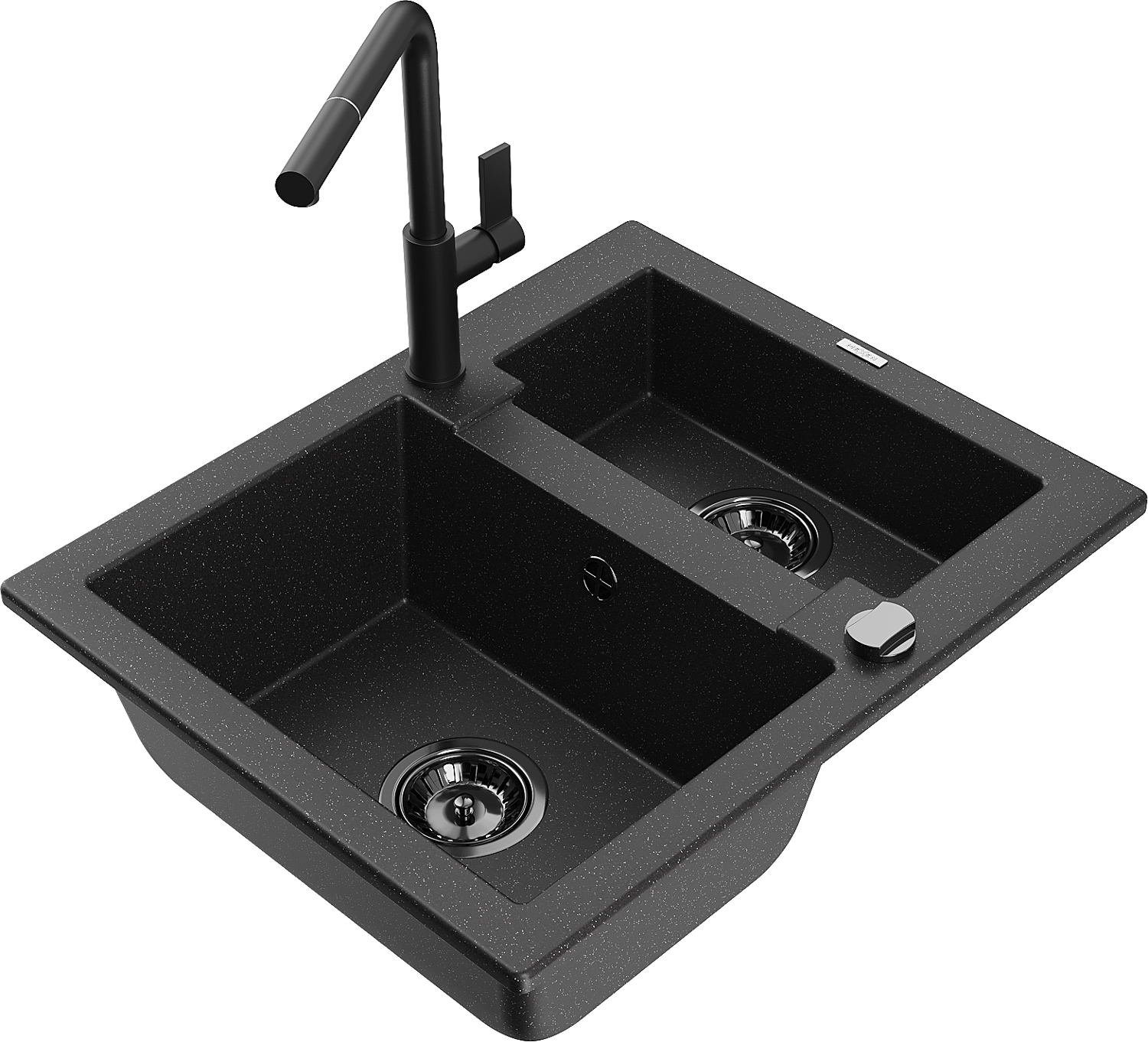 Mexen Carlos žulový drez 1,5-komorový so záhradným ventilom Flora, čierny/strieborný metalický - 6518-73-670401-70-B