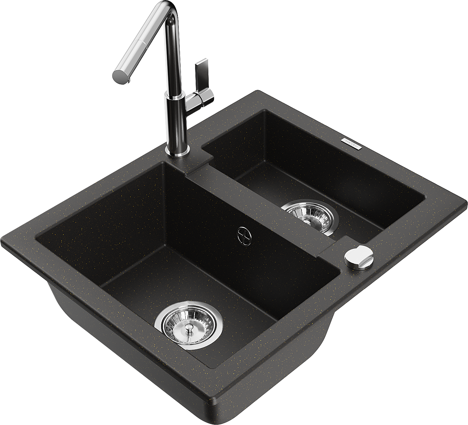 Mexen Carlos granitový drez 1,5-komorový s kuchynskou batériou Flora, čierny/zlatý metalik - 6518-75-670401-00