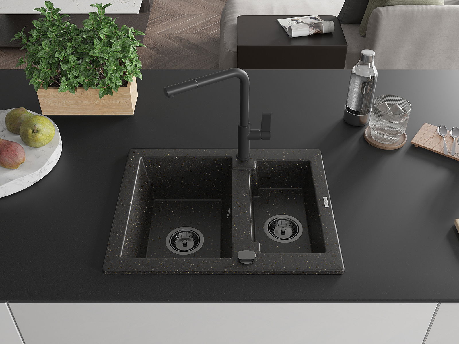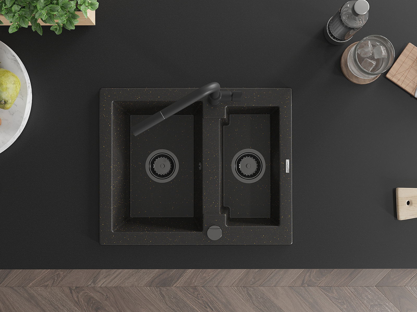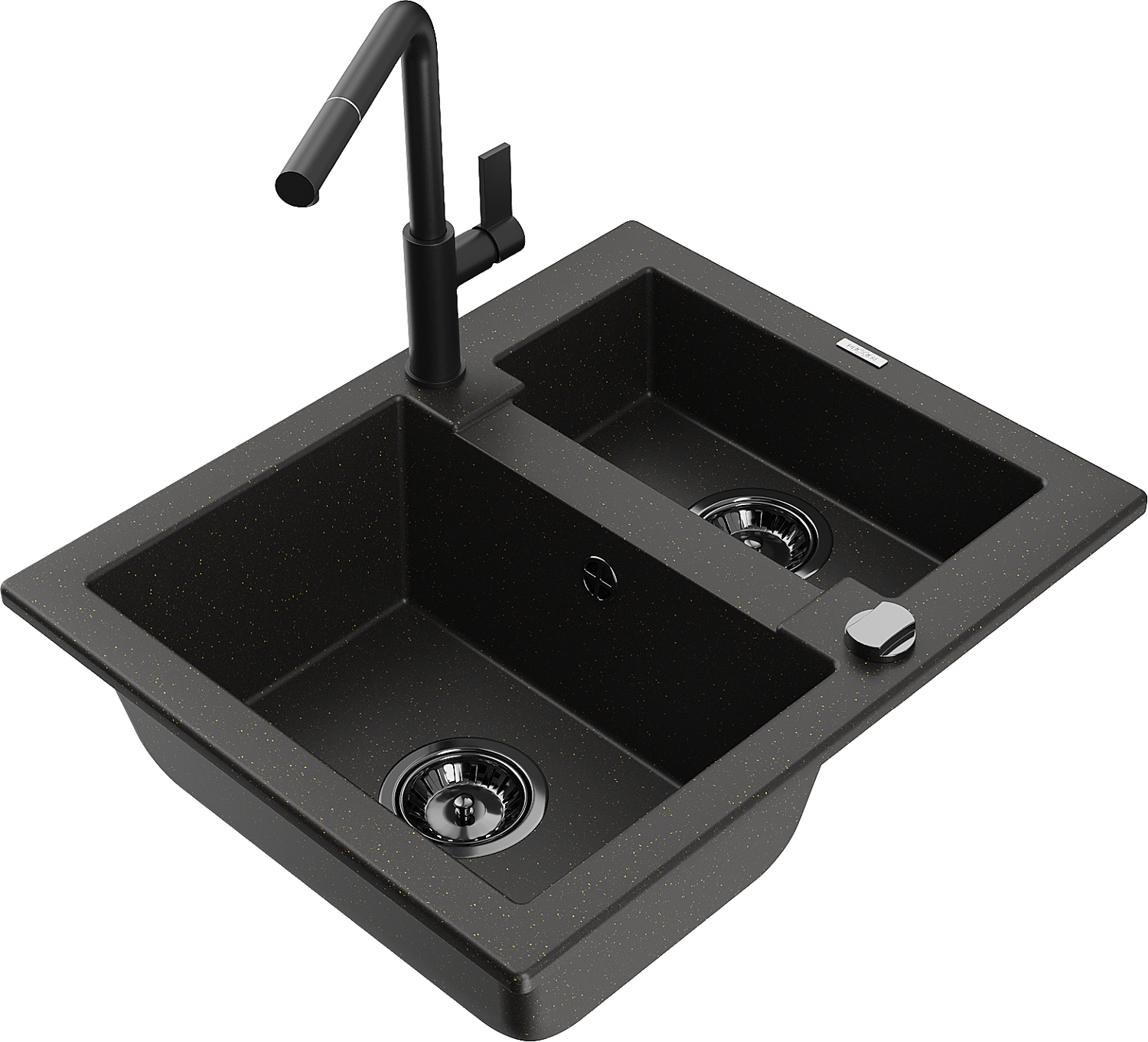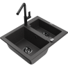 Mexen Carlos žulový drez 1,5-komorový s kuchynskou batériou Flora, čierny/zlatý metalický - 6518-75-670401-70-B