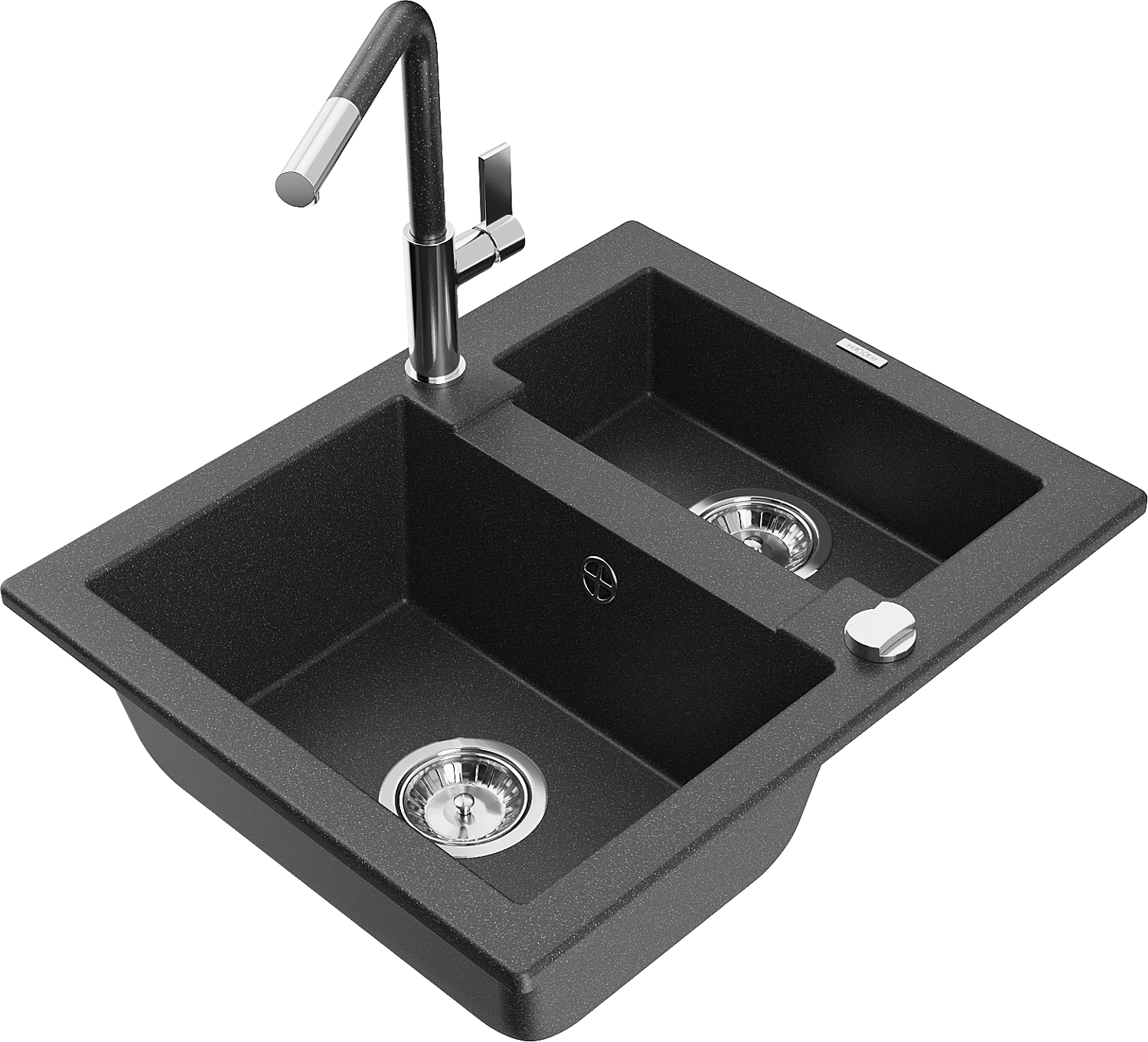 Mexen Carlos žulový drez 1,5-komorový s kuchynskou batériou Flora, čierny škvrnitý - 6518-76-670401-08