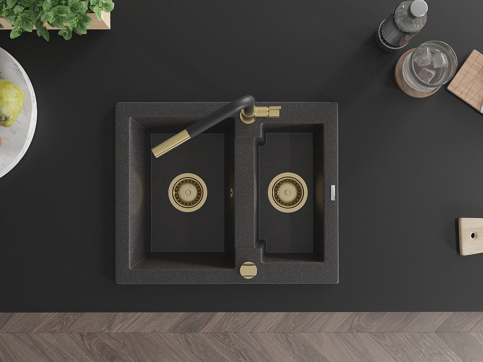 Mexen Carlos granitový drez 1,5-komorový s kuchynskou batériou Flora, čierny škvrnitý - 6518-76-670401-57-G