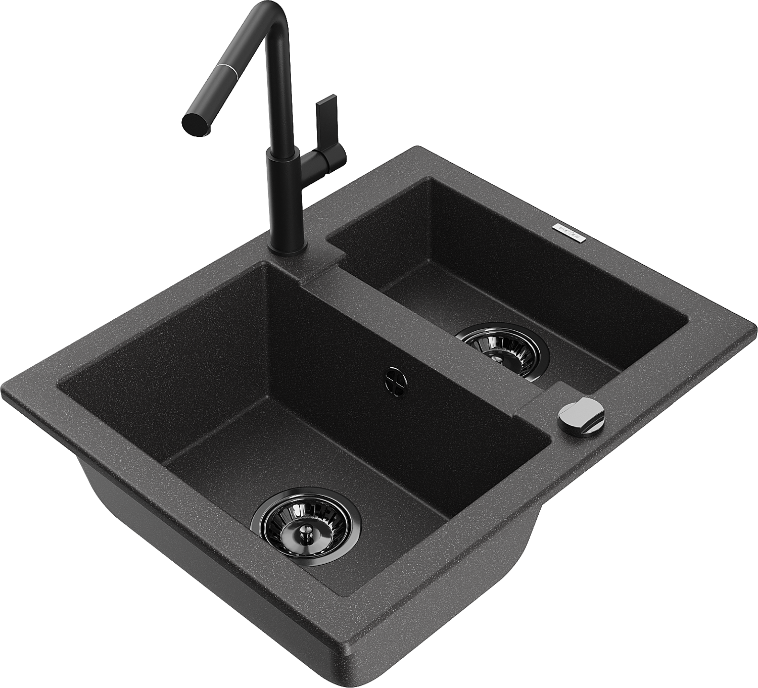 Mexen Carlos žulový drez 1,5-komorový s kuchynskou batériou Flora, čierno škvrnitý - 6518-76-670401-70-B