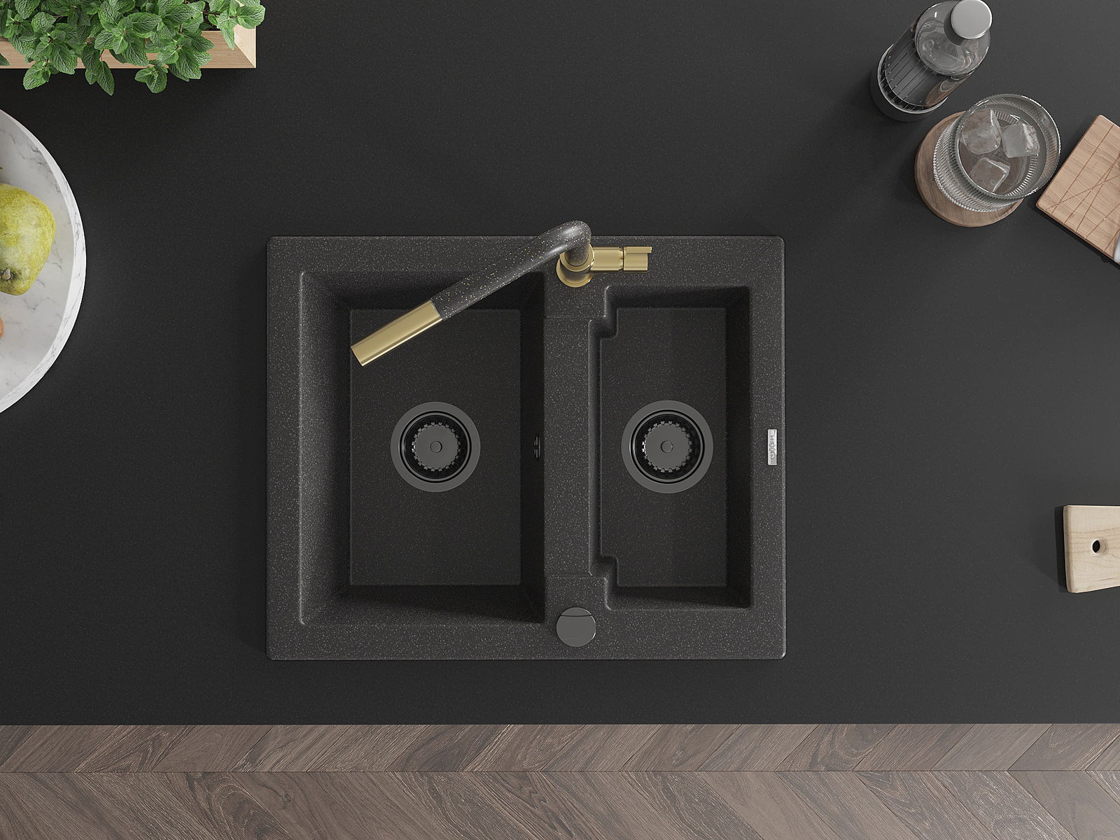 Mexen Carlos granitový drez 1,5-komorový s kuchynskou batériou Flora, čierny škvrnitý - 6518-76-670401-75-B