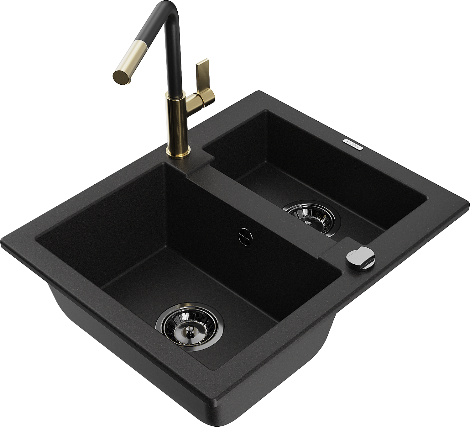 Mexen Carlos žulový drez 1,5-komorový s kuchynskou batériou Flora, čierny - 6518-77-670401-57-B