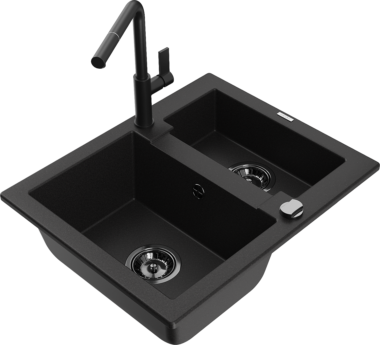 Mexen Carlos žulový drez s 1,5 komorami s kuchynskou batériou Flora, čierny - 6518-77-670401-70-B