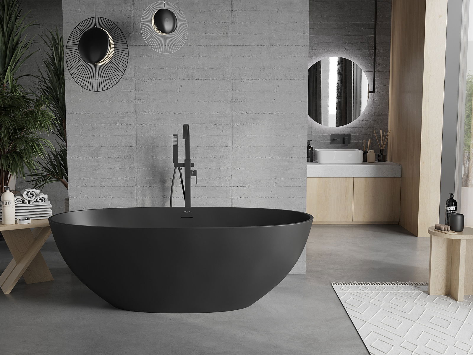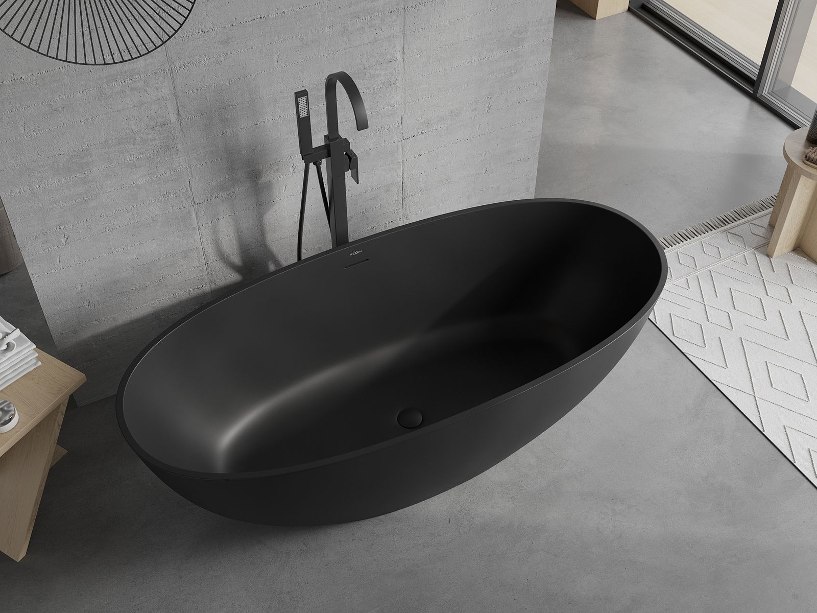 Voľne stojaca vaňa 165 x 75 cm z konglomerátu je vynikajúcou voľbou pre milovníkov moderného dizajnu. Jej oválny tvar a matná povrchová úprava v čiernej farbe priťahujú pozornosť, pridávajúc eleganciu každej kúpeľni. Produkt je odolný voči matovaniu a UV žiareniu, čo zaručuje dlhodobé používanie. Navyše, vaňa je vybavená praktickým prepadom a sifónom s klik-klak zátkou, čo zvyšuje pohodlie pri používaní. Výška 55 cm a hĺbka 43 cm zaručujú pohodlie počas kúpania.