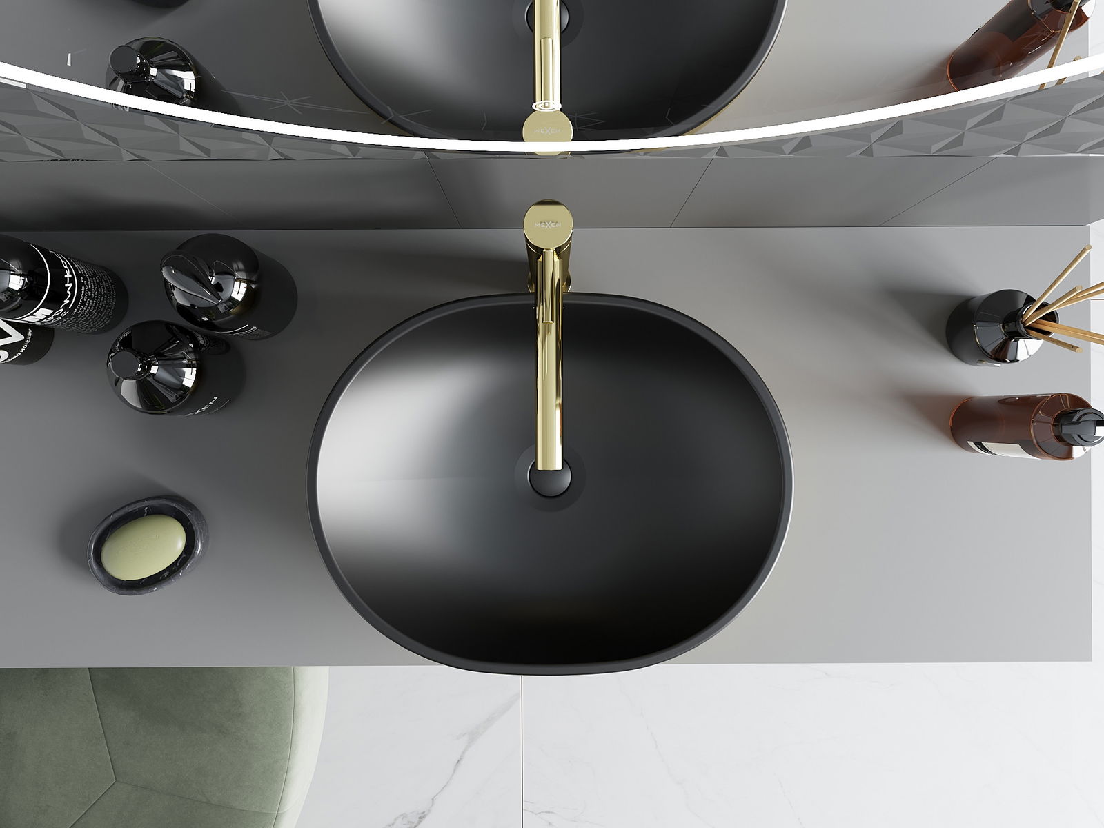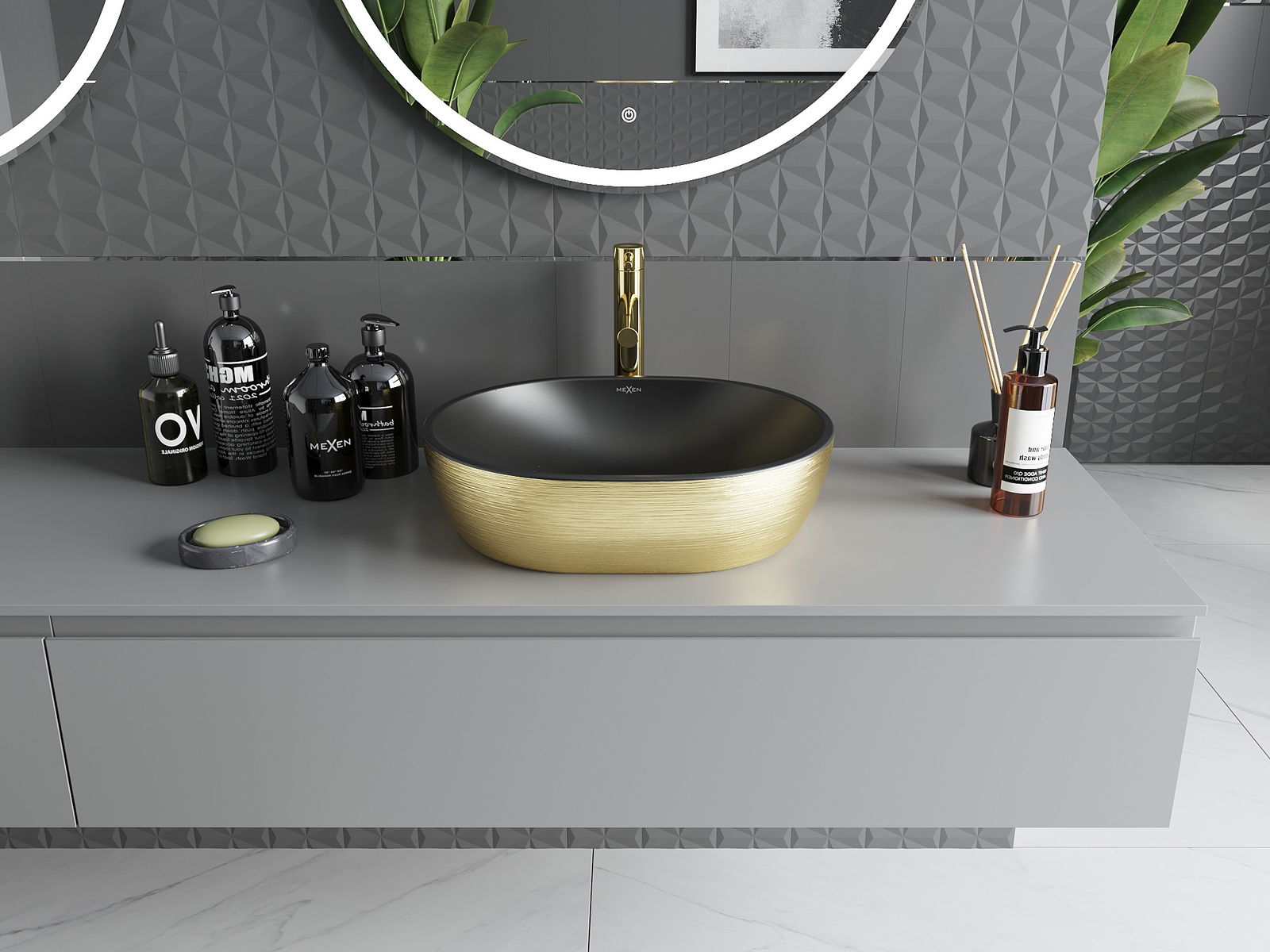 Umývadlo na doske je ideálne riešenie pre moderné interiéry. S rozmermi 48x35 cm a hĺbkou 11,5 cm, dokonale sa hodí do každej kúpeľne. Jeho elegantný čierny matný povrch so zlatým líniovým vzorom je kombináciou štýlu a funkčnosti. Vyrobené z vysoko kvalitnej sanitárnej keramiky, umývadlo je nielen estetické, ale aj odolné. Bez otvorov na batériu a prepad, prezentuje minimalistický dizajn, ktorý podčiarkne charakter vašej priestoru.