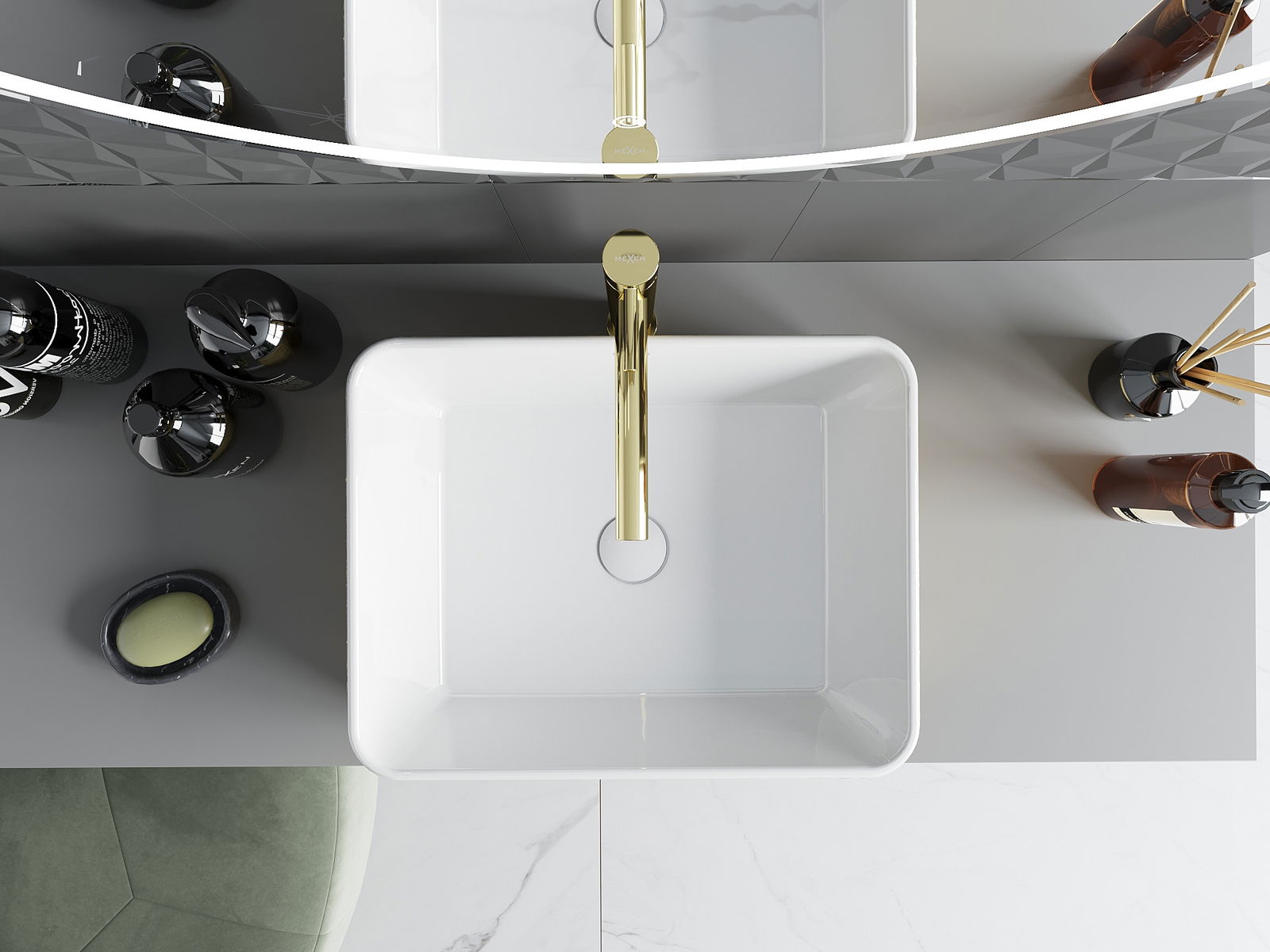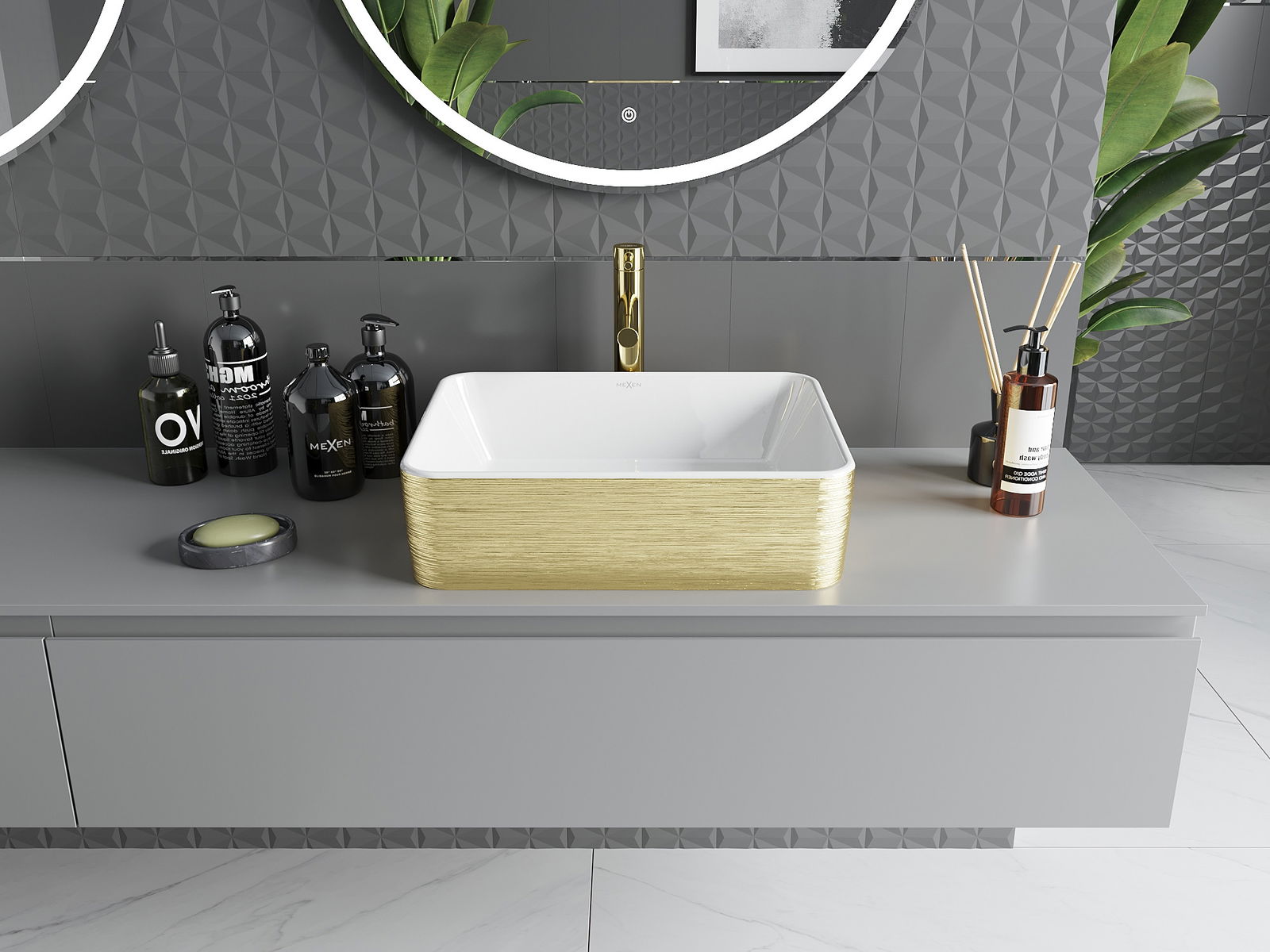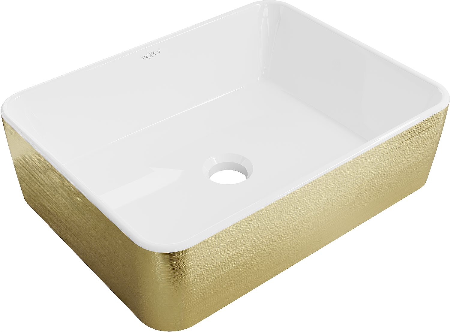Mexen Catia je elegantné umývadlo na dosku s rozmermi 48 x 38 cm v bielej a zlatej farbe, ideálne pre moderné kúpeľne. Vyrobené z vysoko kvalitnej sanitárnej keramiky, vyniká obdĺžnikovým tvarom a matným povrchom, čo jej dodáva jedinečný šarm. Absencia otvorov na batérie a prepad zabezpečuje minimalistický dizajn a dodatočná ochranná vrstva zvyšuje trvanlivosť. Ideálna na úpravu interiéru v luxusnom alebo škandinávskom štýle.