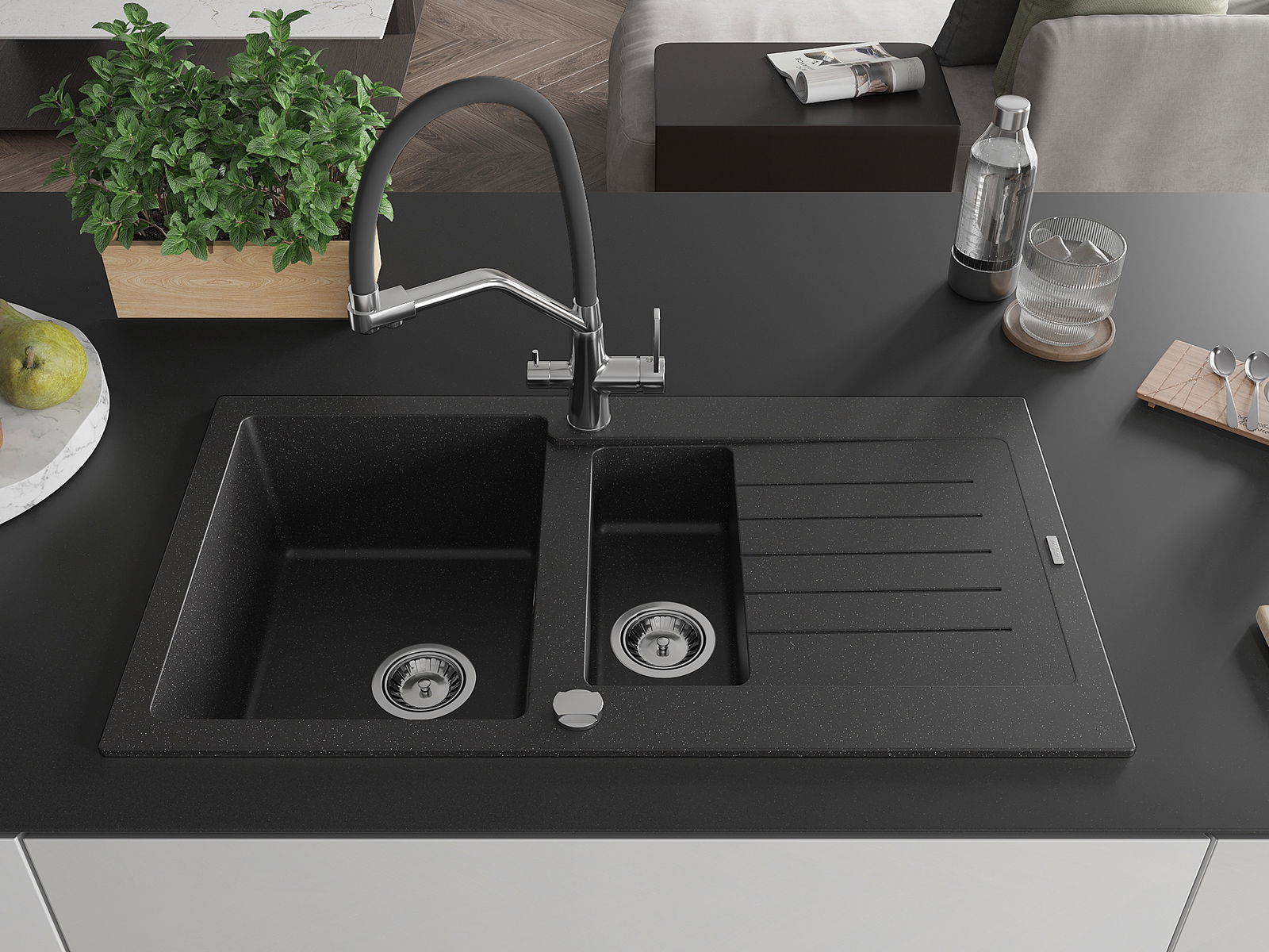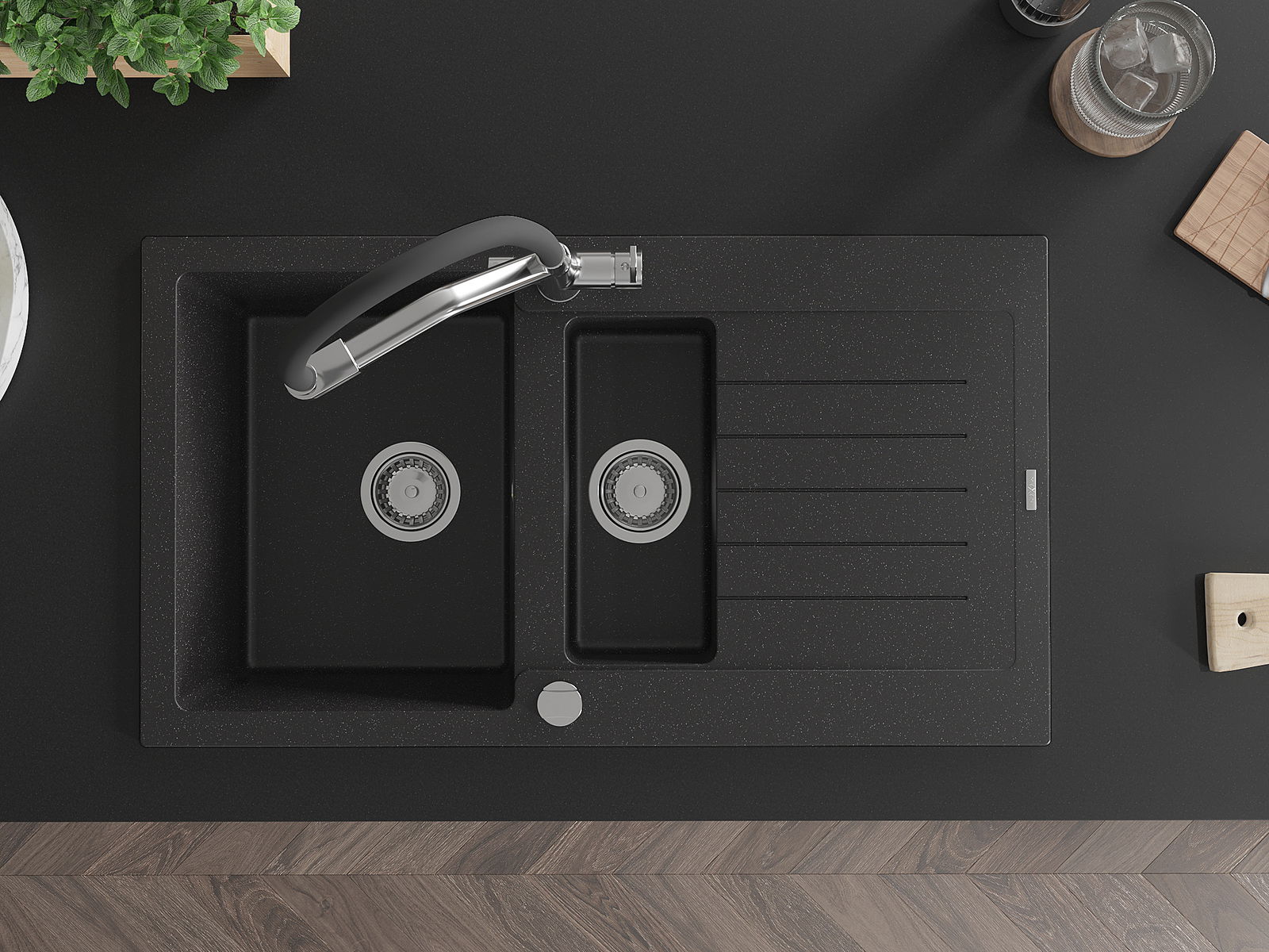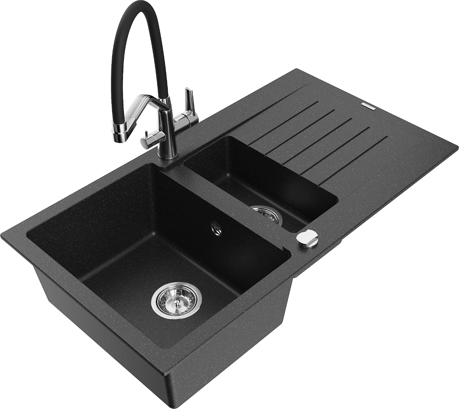 Mexen Matias granitový drez s 1,5 komorami, s odkvapkávačom a kuchynskou batériou Duo, čierno/strieborný metalický
