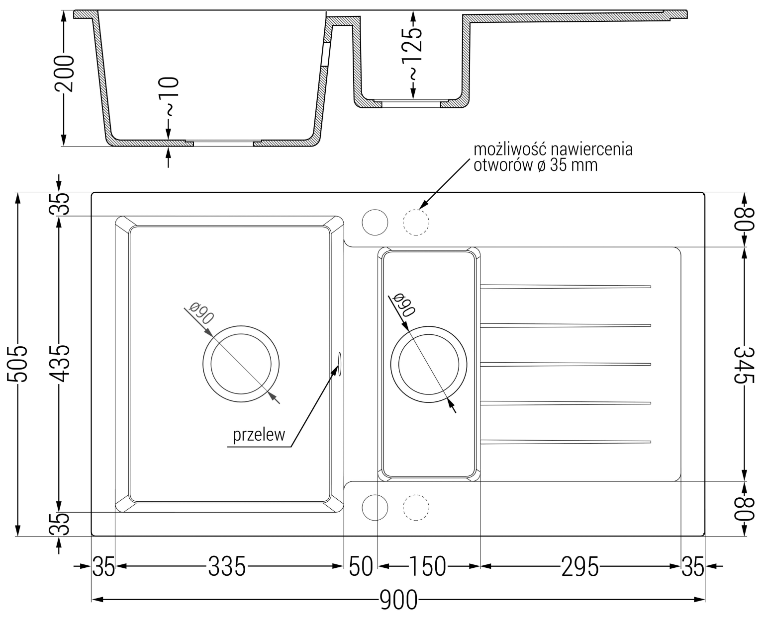Drez má 2 predfrézované otvory s priemerom 35 mm, ktoré si môžete vlastnoručne vyraziť. Môžete ich využiť napríklad na montáž dávkovača na tekutinu, ktorý eliminuje prítomnosť plastových fliaš v kuchyni a dodá jej elegantný vzhľad.