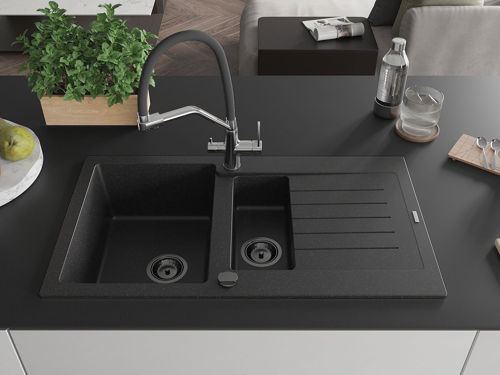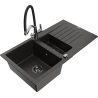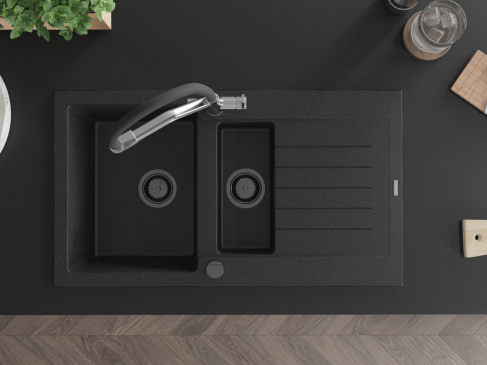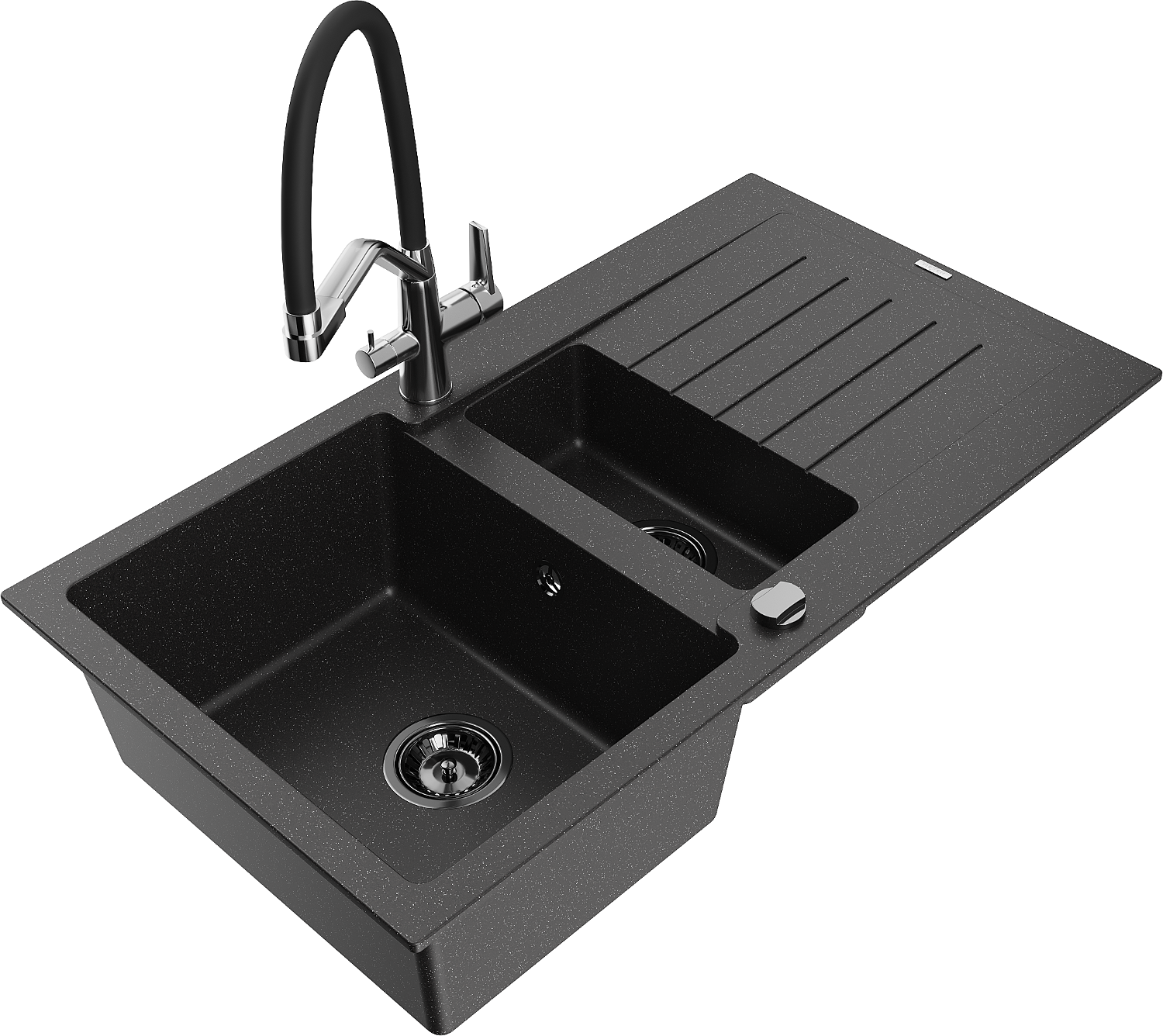 Mexen Matias žulový drez 1,5-komorový s odkvapkávačom a kuchynskou batériou Duo, čierny/strieborný - 6502-73-671701-07-B