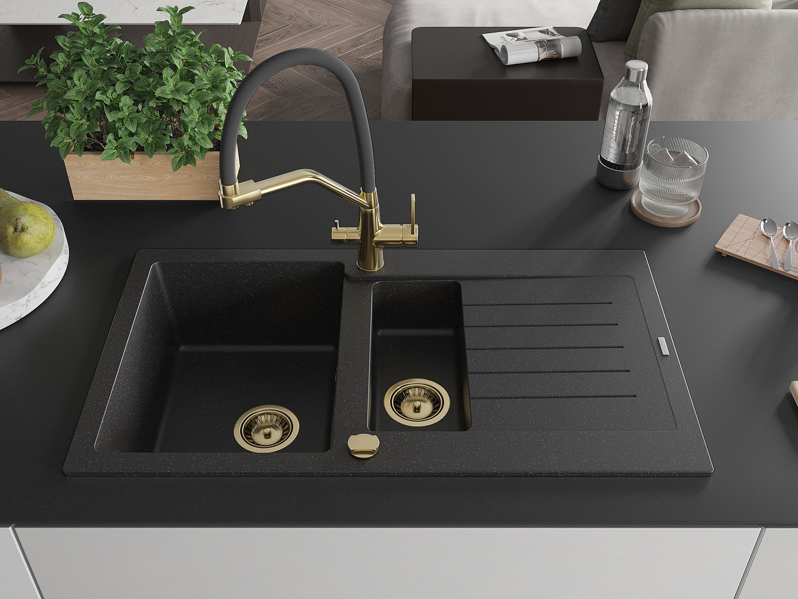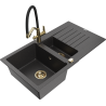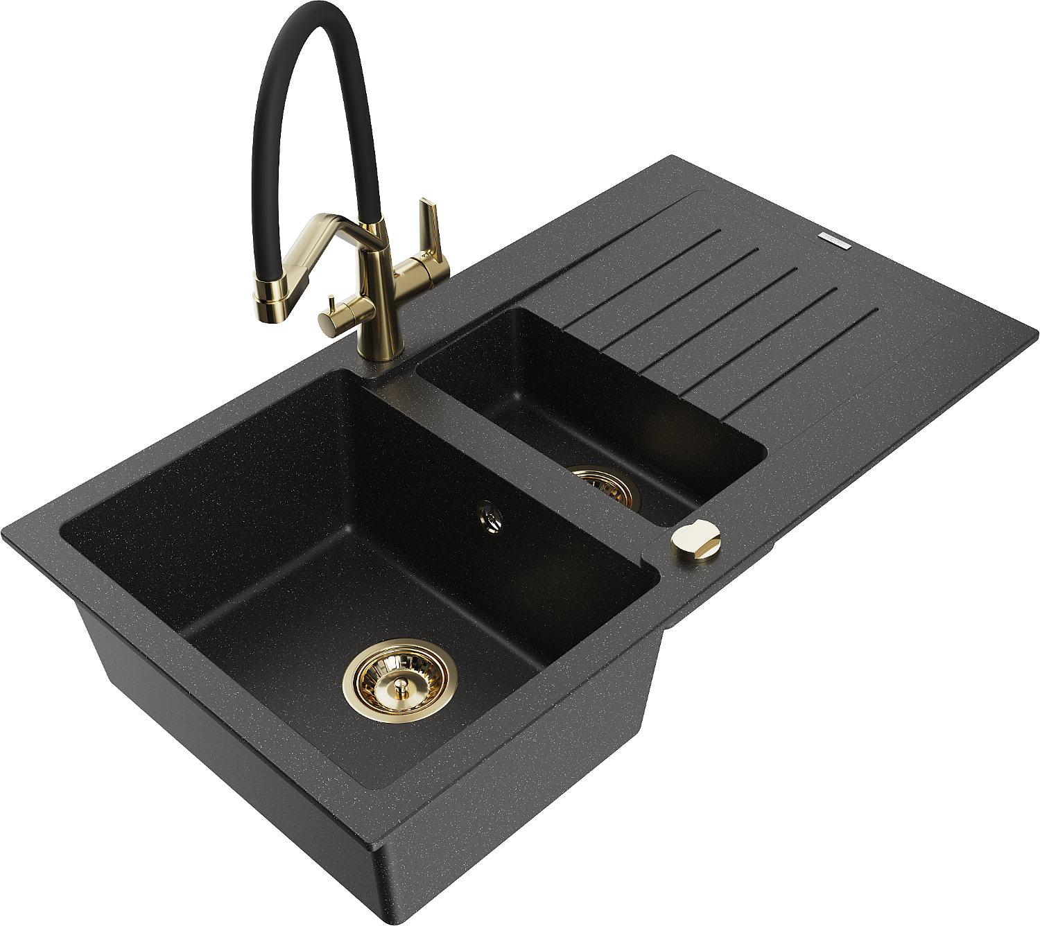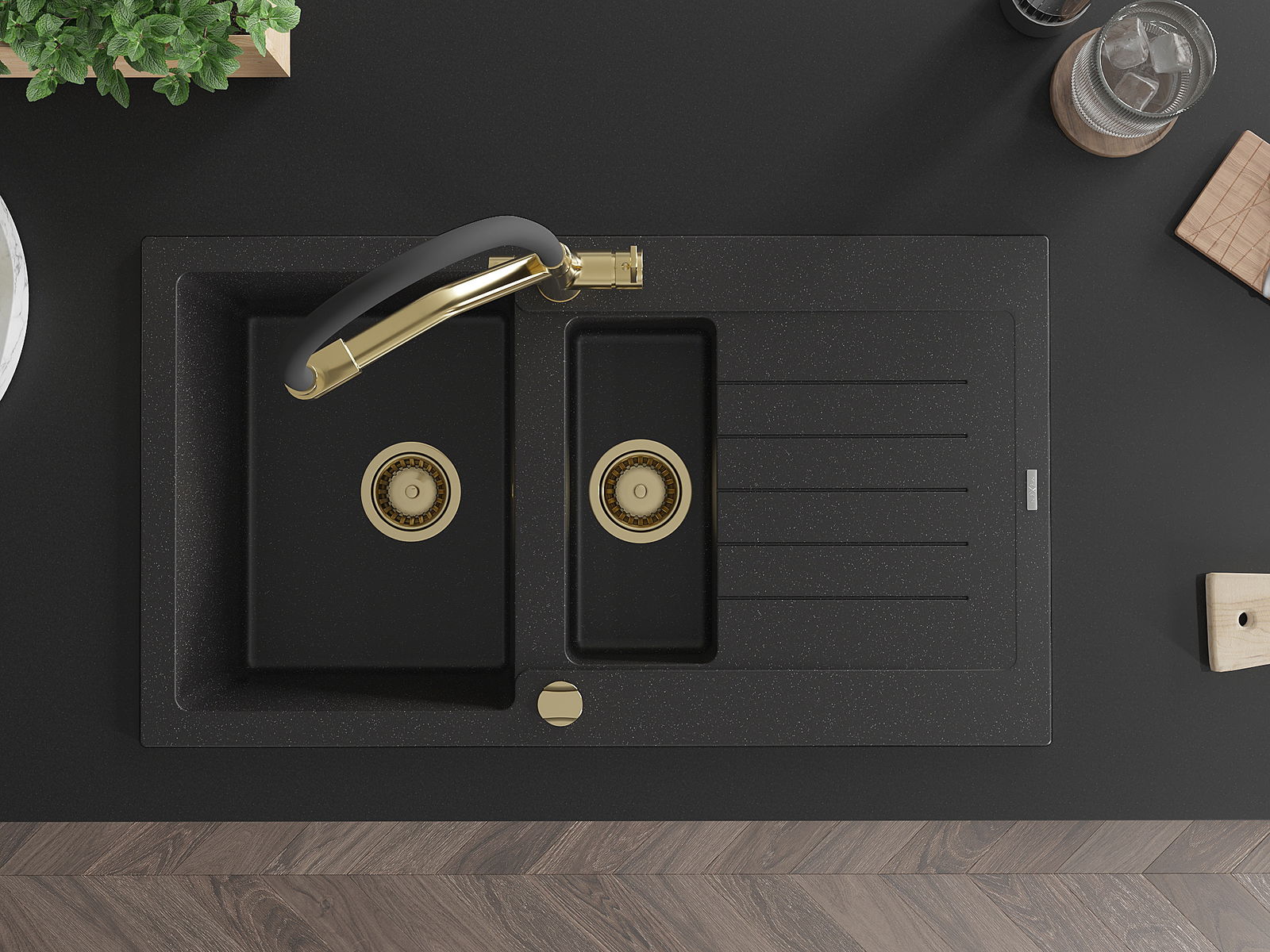 Mexen Matias granitový drez s 1,5 komorou s odkvapkávacou plochou a kuchynskou batériou Duo, čierny/strieborný