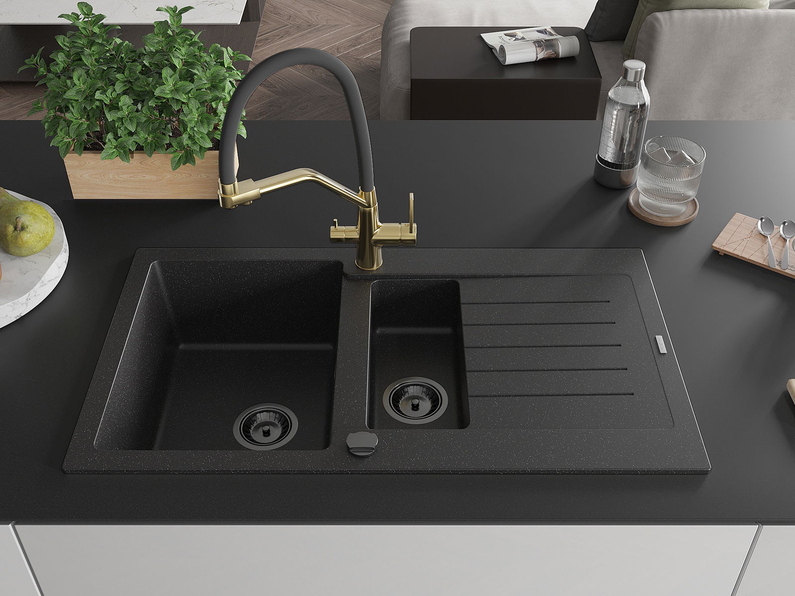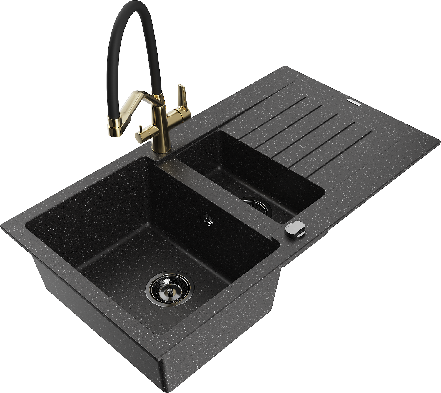Mexen Matias žulový drez 1,5-komorový s odkvapkávačom a kuchynskou batériou Duo, čierny/strieborný - 6502-73-671701-57-B