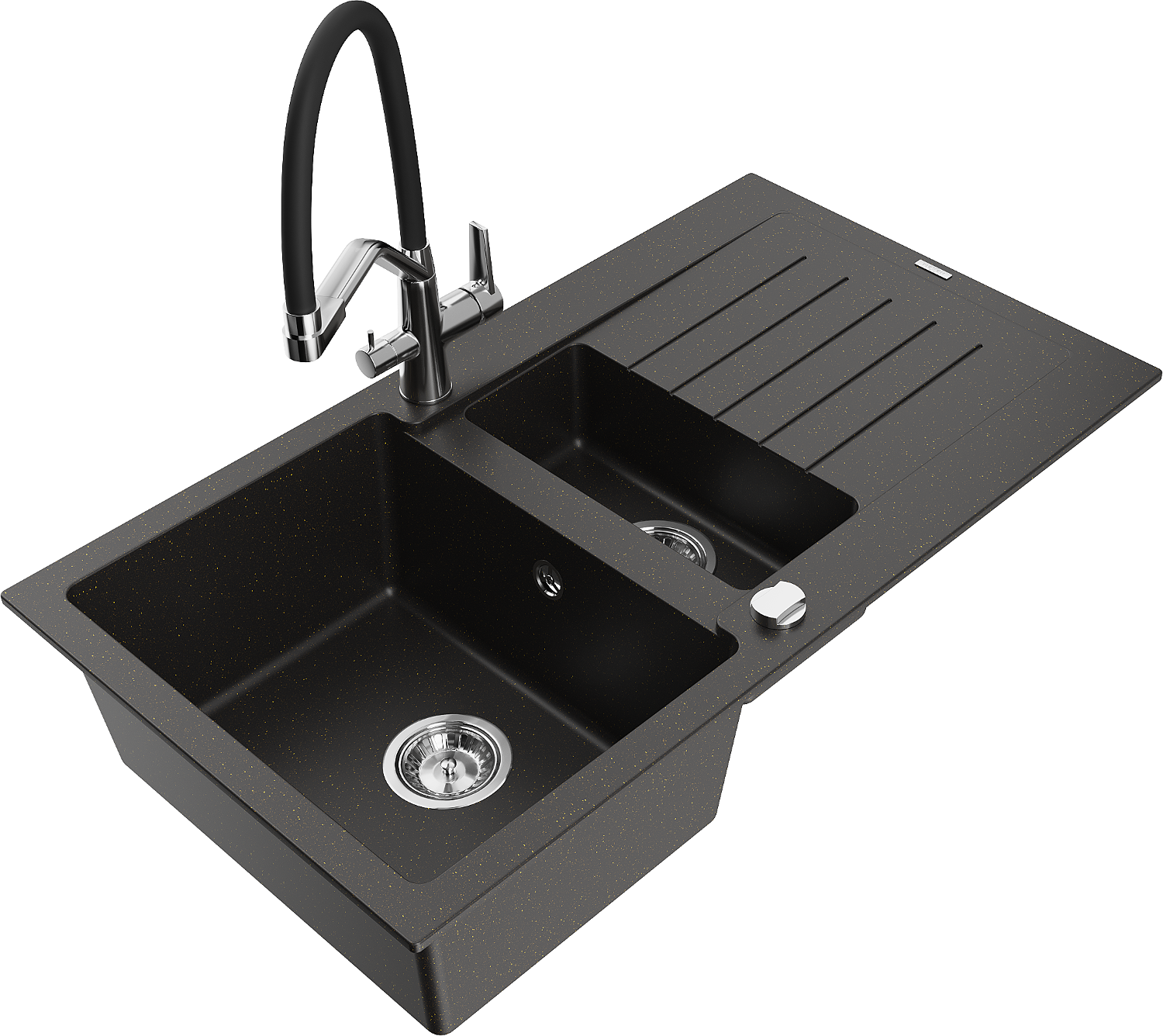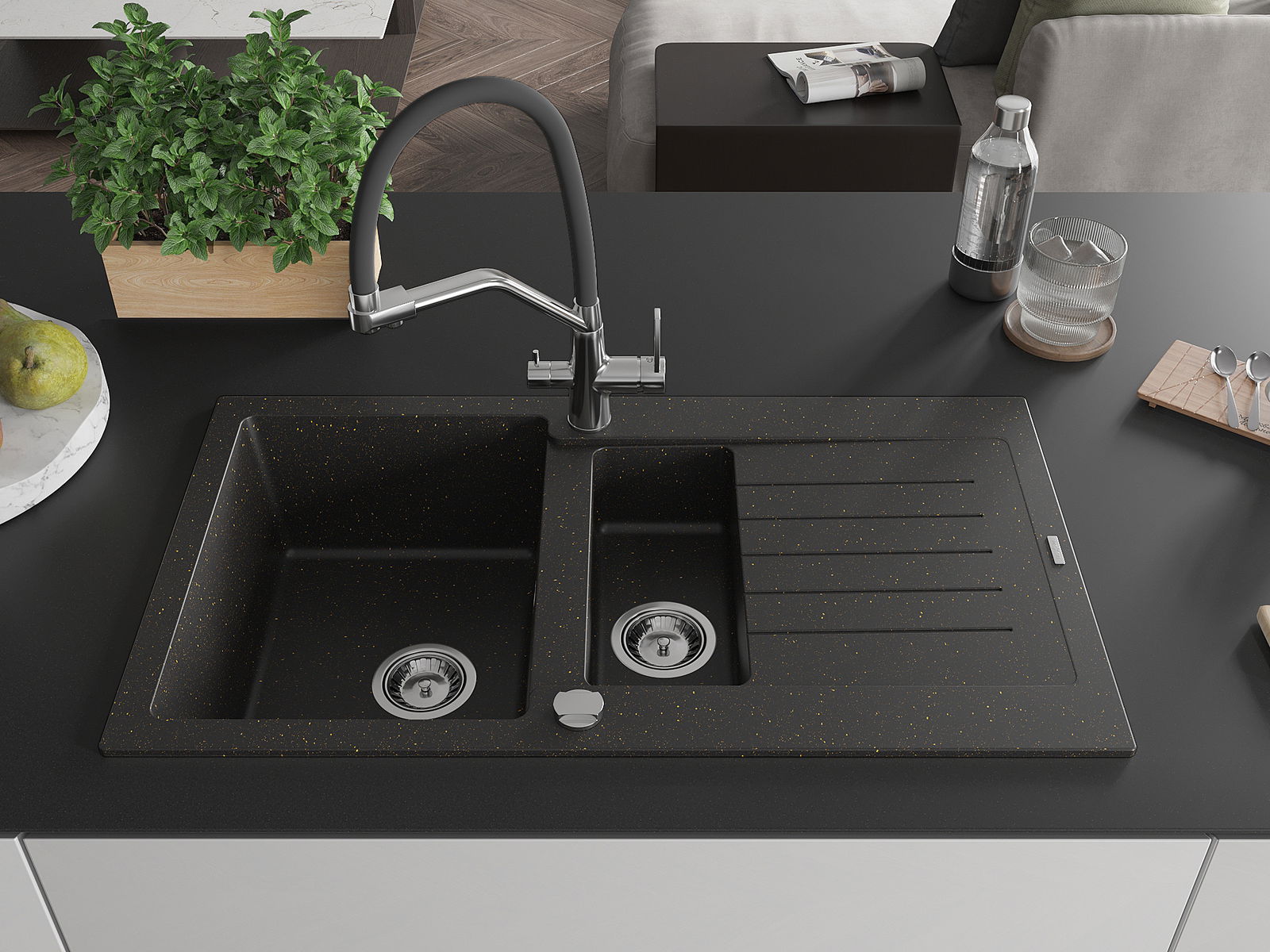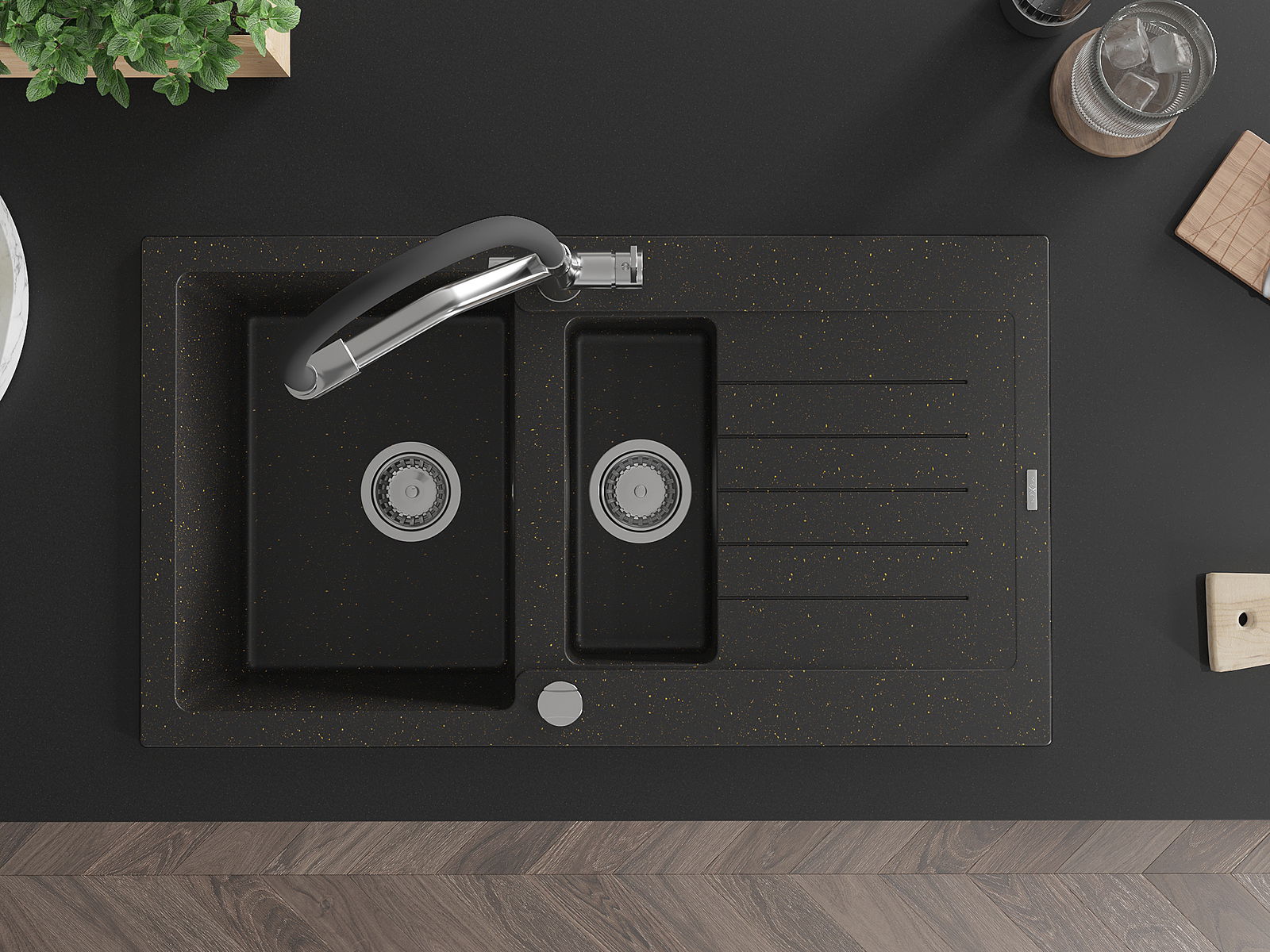 Mexen Matias granitový drez 1,5-komorový s odkvapkárom a kuchynskou batériou Duo, čierny/zlatý metalik - 6502-75-671701-07