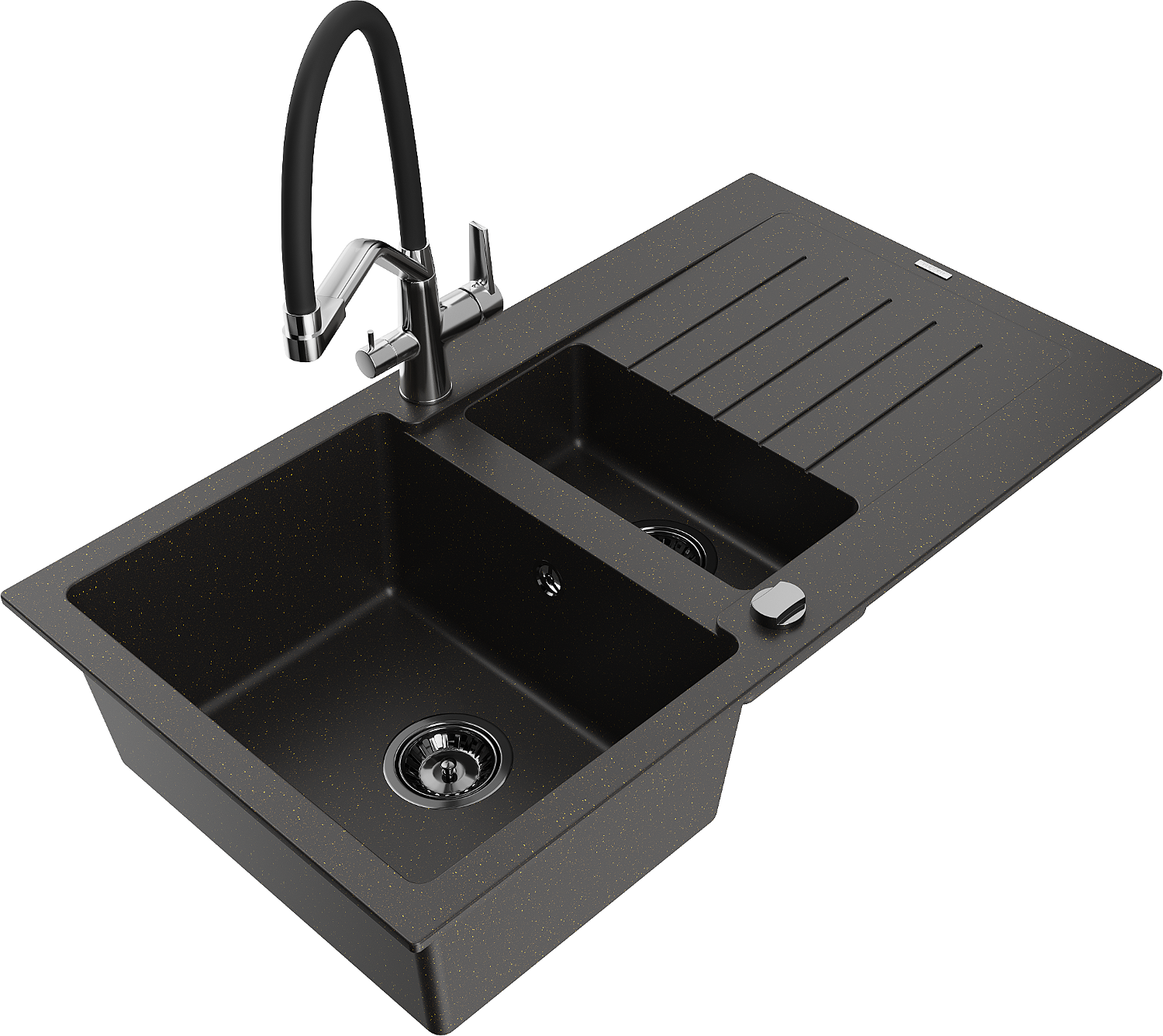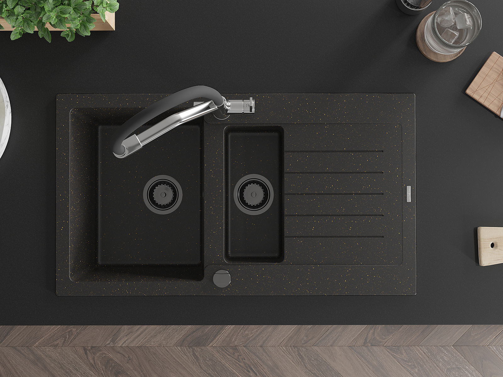 Mexen Matias granitový drez s 1,5 komorou s odkvapkávačom a kuchynskou batériou Duo, čierny/zlatý metalick