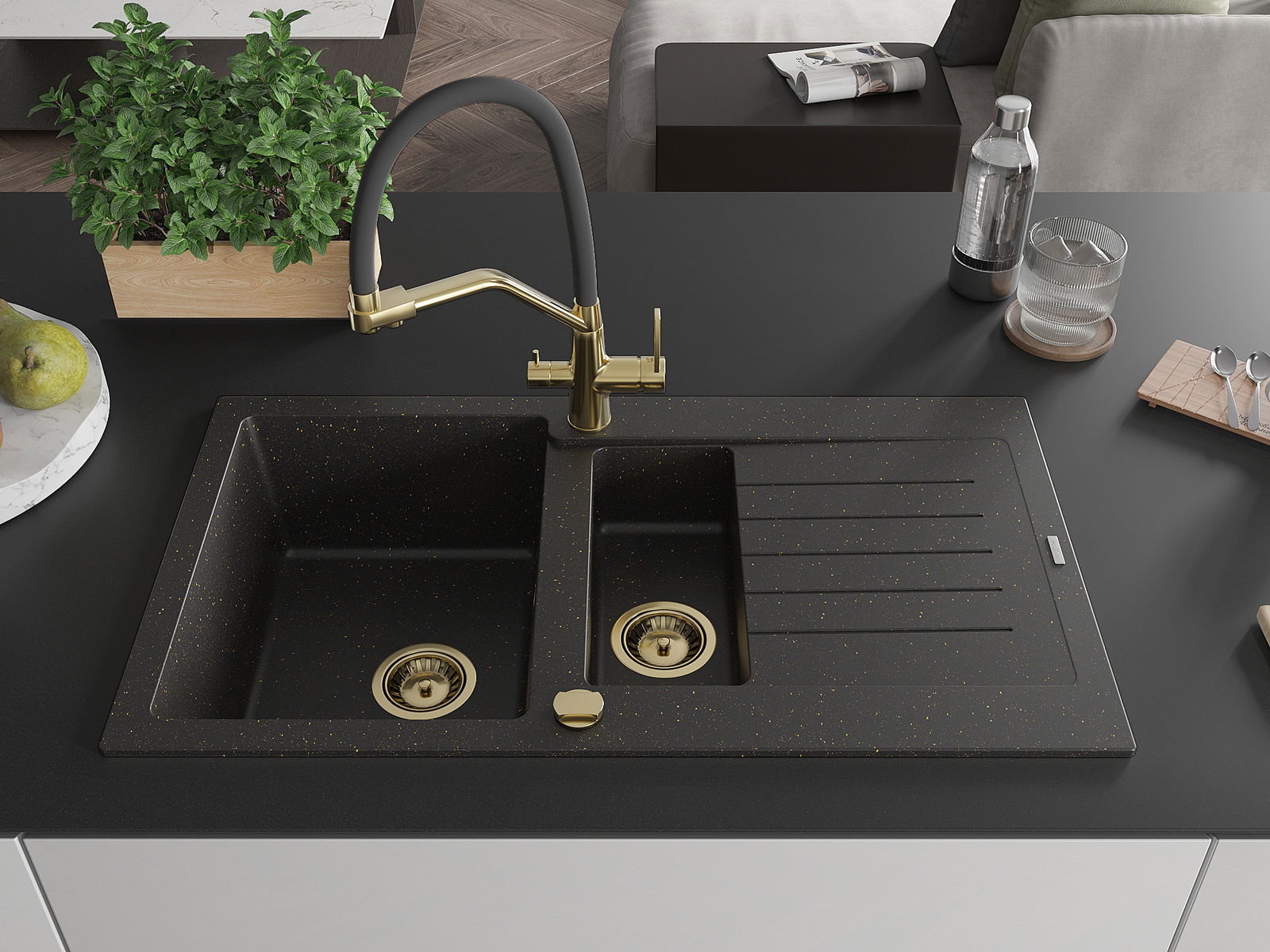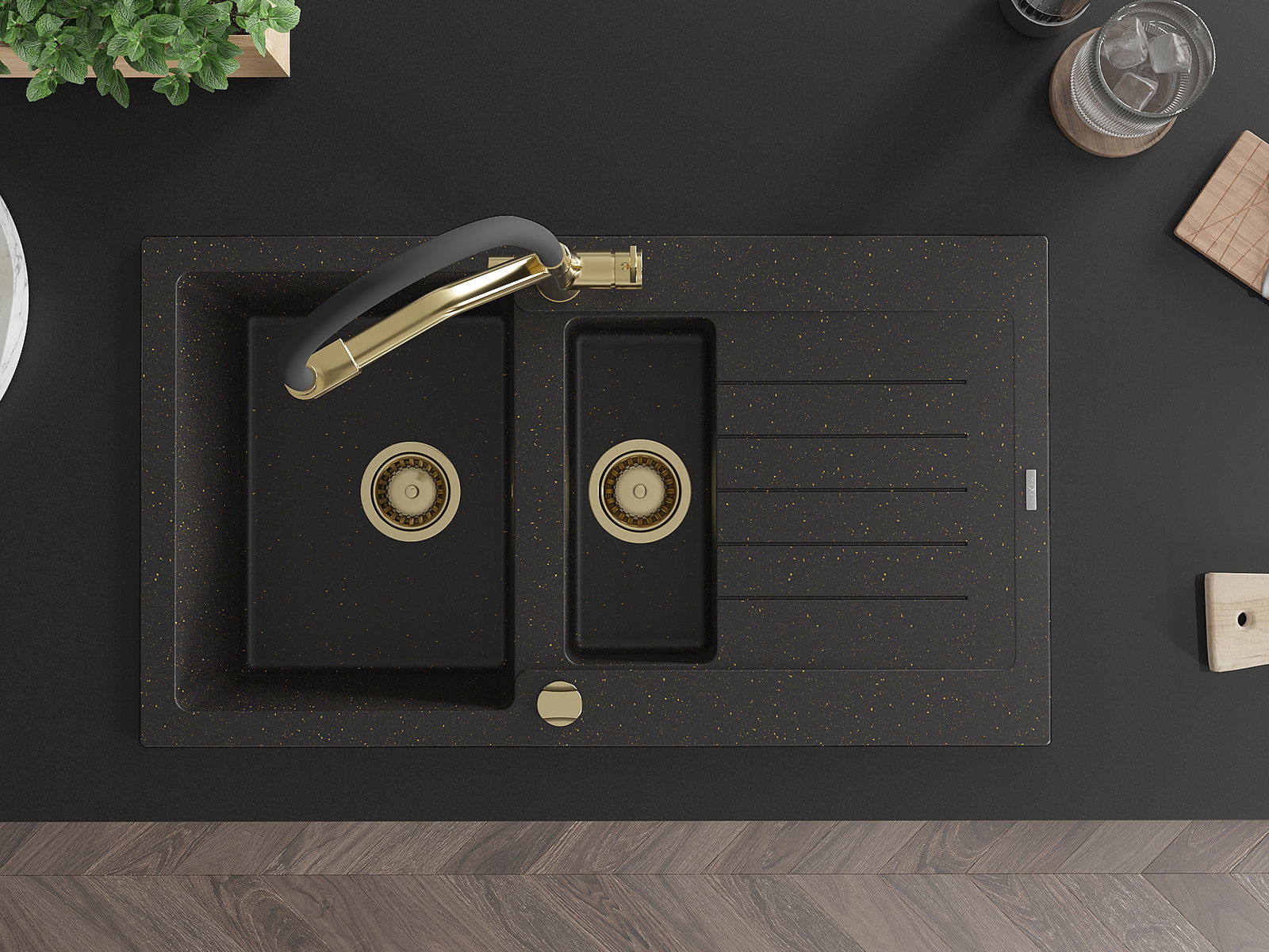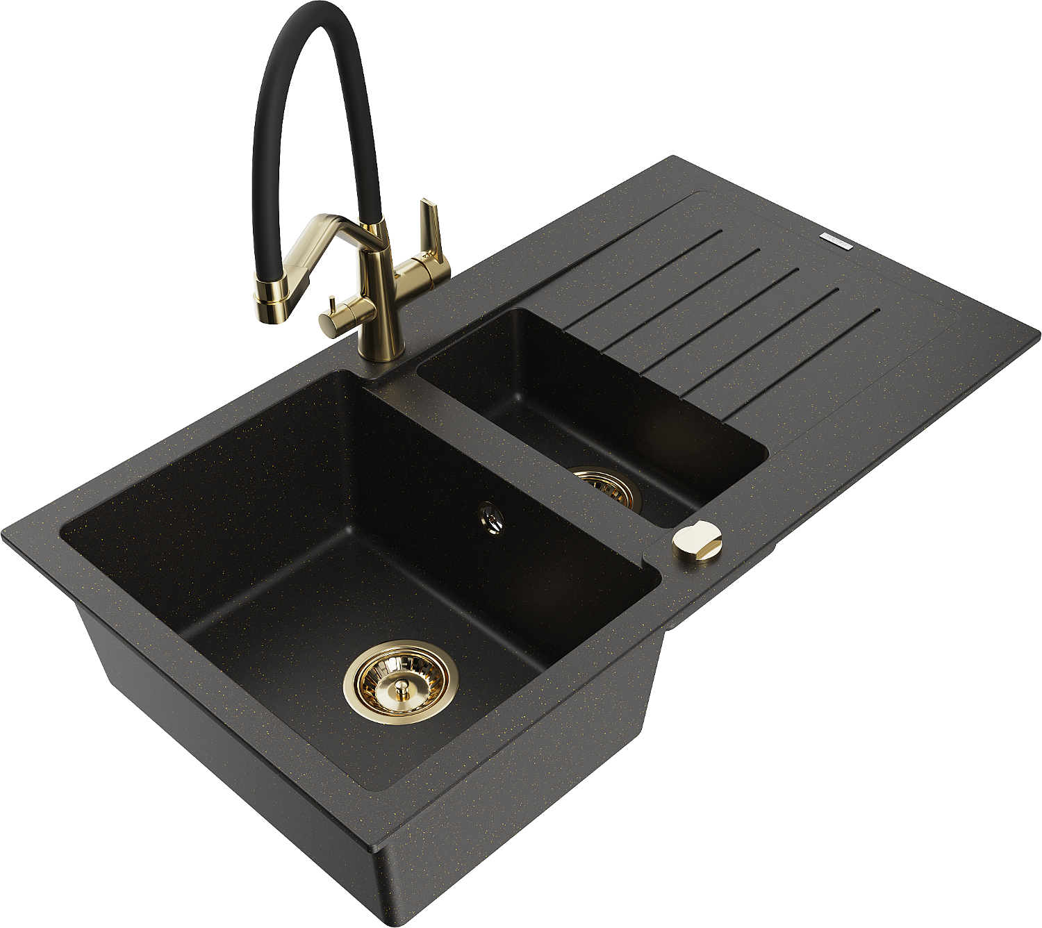 Mexen Matias žulový drez 1,5-komorový s odkvapkávačom a kuchynskou batériou Duo, čierny/zlatý metalik - 6502-75-671701-57-G