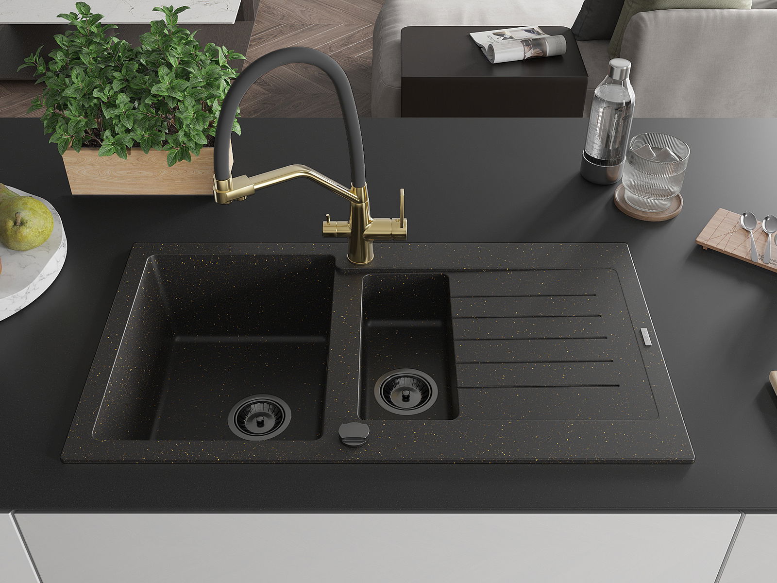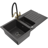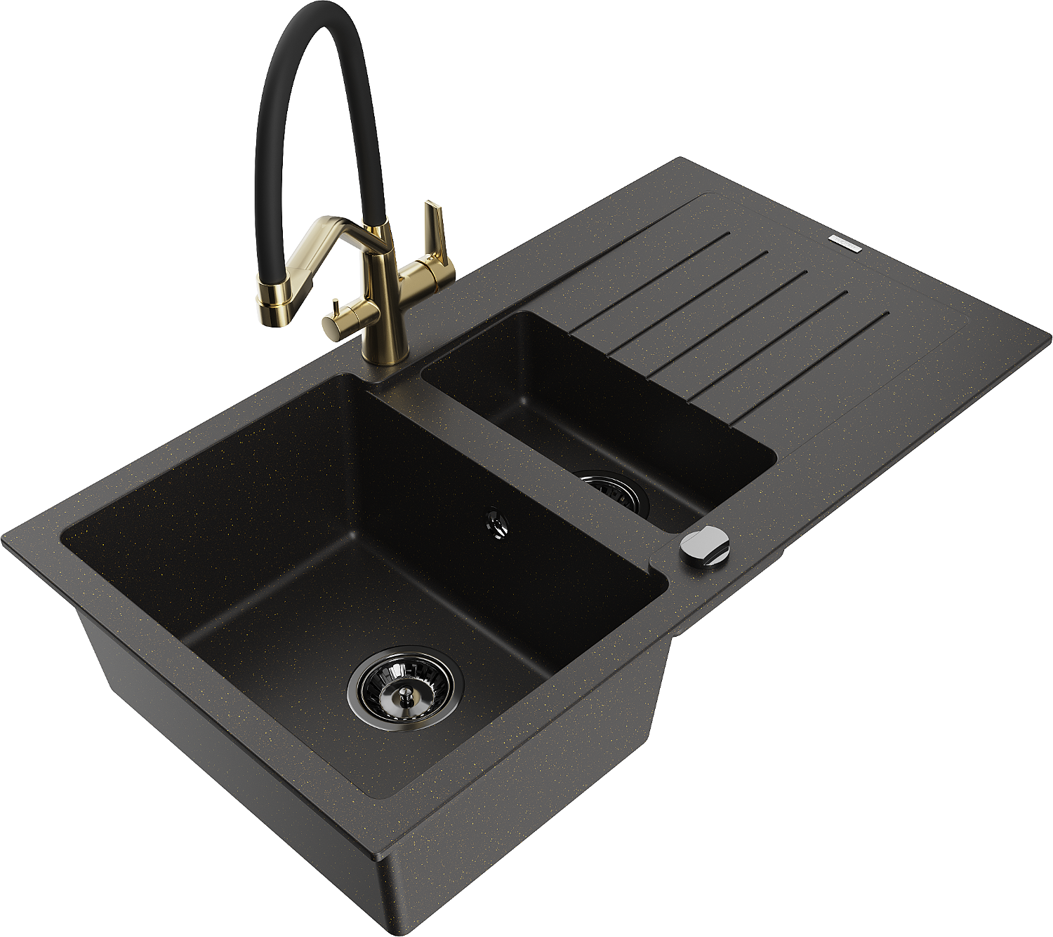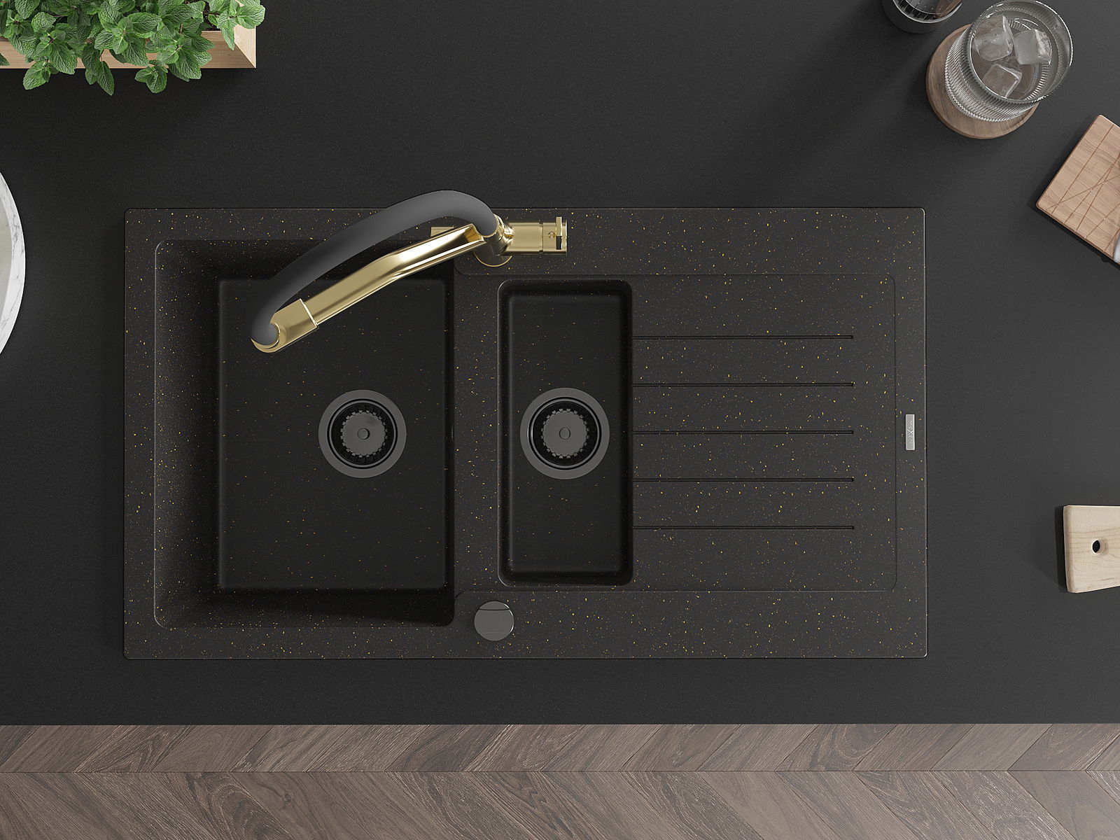 Mexen Matias granitový drez 1,5-komorový s odkvapkávacou doskou a kuchynskou batériou Duo, čierny/zlatý metalický