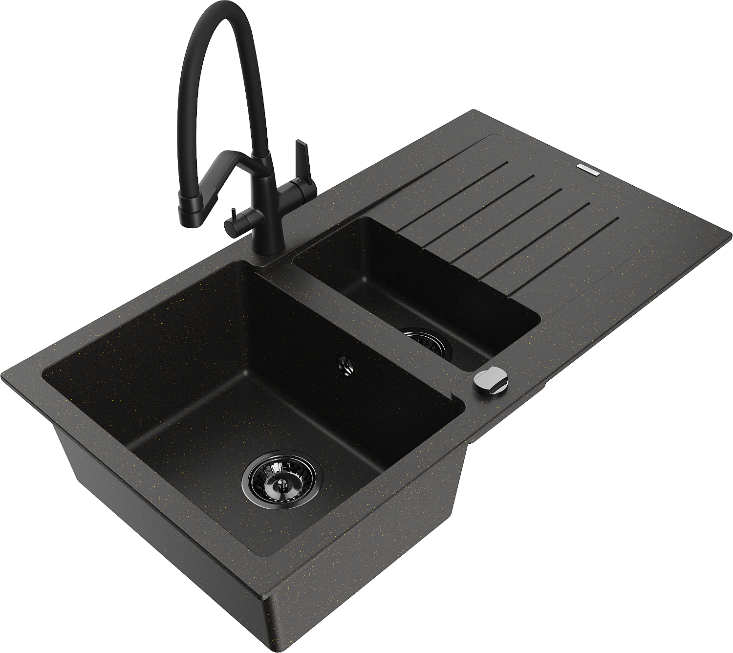 Mexen Matias žulový drez 1,5-komorový s odkvapkávačom a kuchynskou batériou Duo, čierny/zlatý metalik - 6502-75-671701-70-B