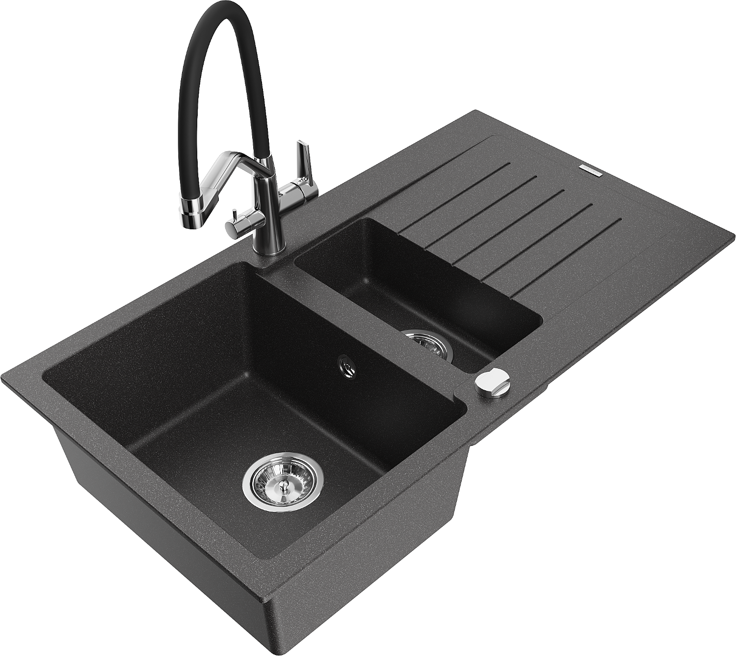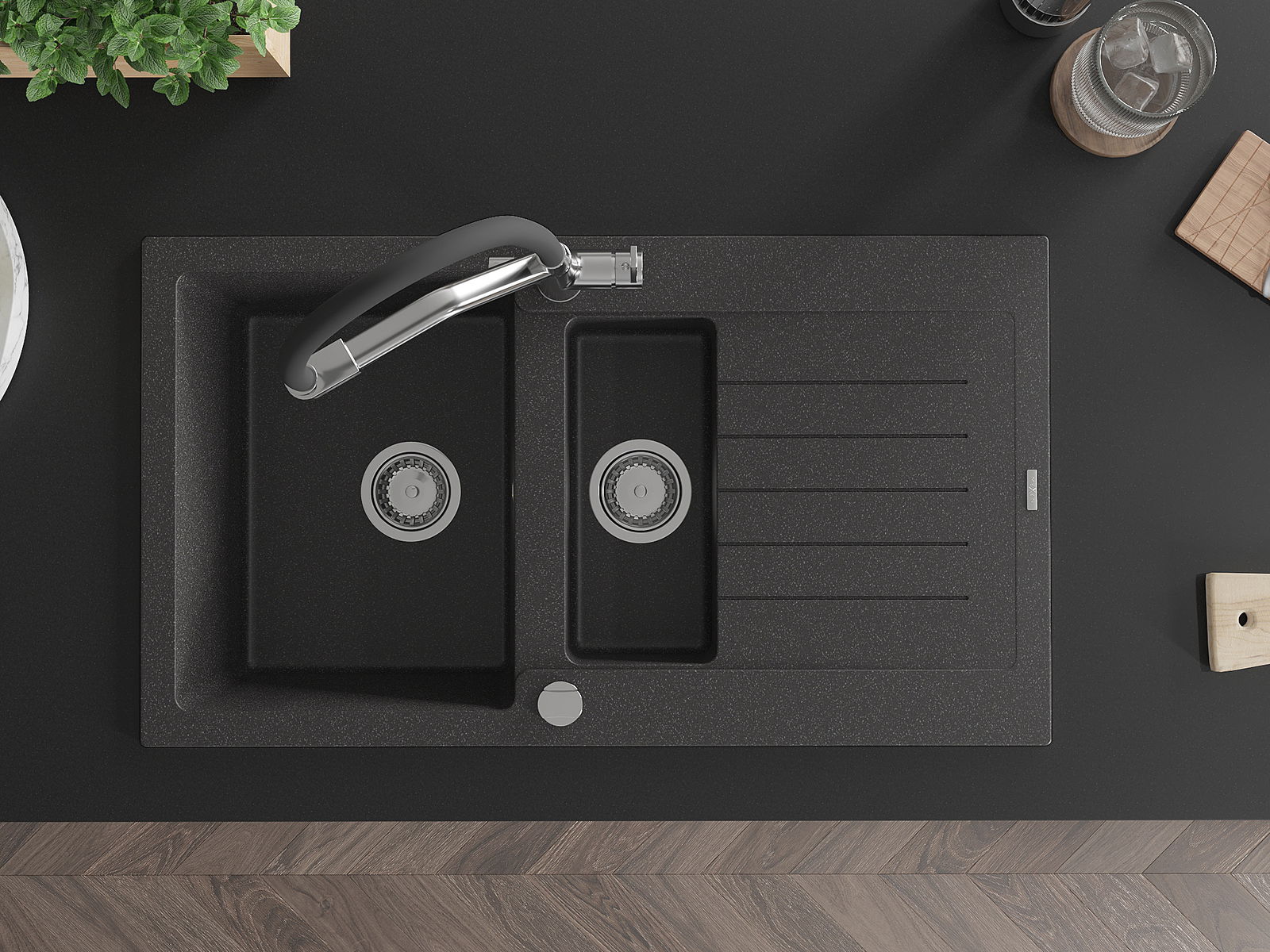 Mexen Matias granitový drez 1,5-komorový s odkvapkávacou plochou a kuchynskou batériou Duo, čierny s bodkami