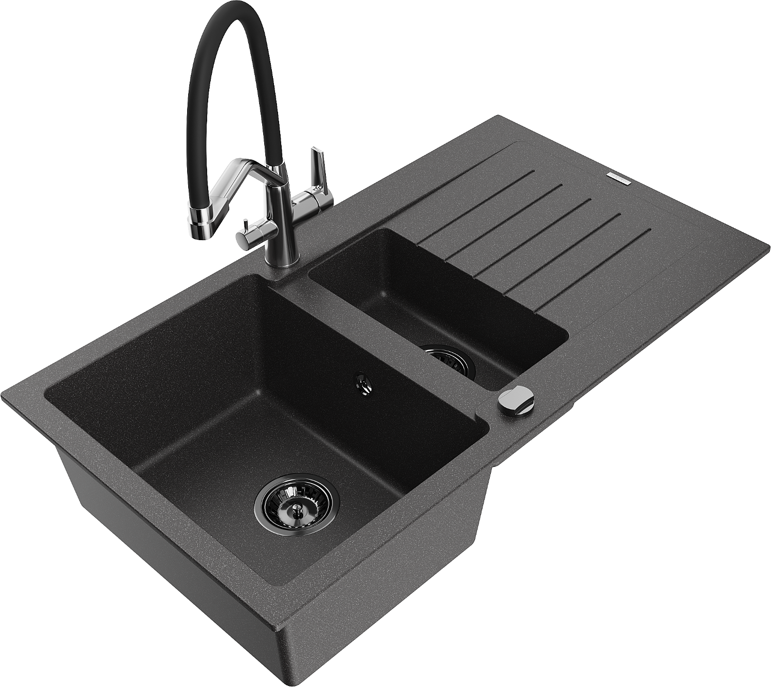 Mexen Matias granitový drez 1,5-komorový s odkvapkávačom a kuchynskou batériou Duo, čierny bodkovaný - 6502-76-671701-07-B