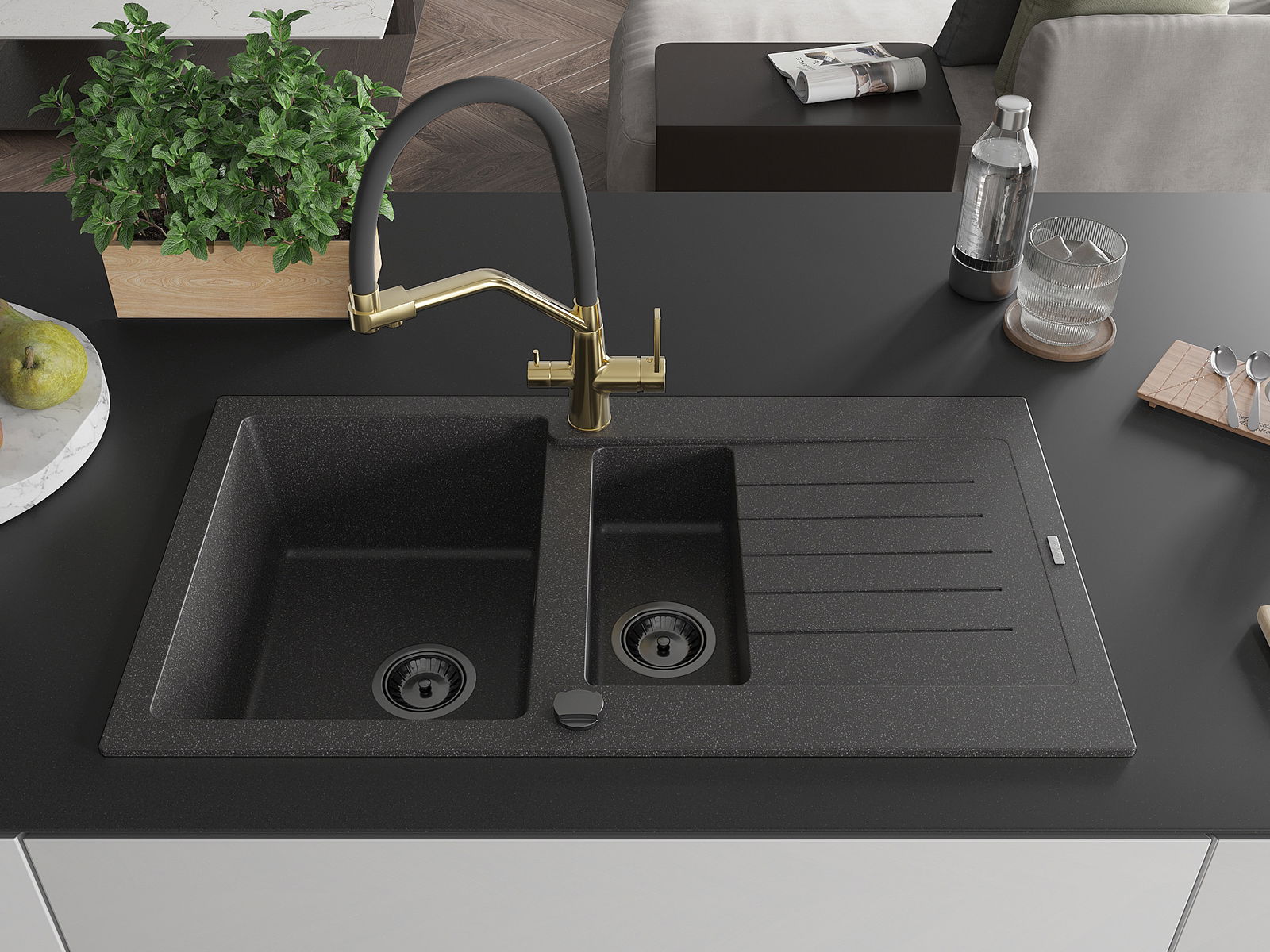 Mexen Matias granitový drez 1,5-komorový s odkvapkávačom a kuchynskou batériou Duo, čierny s kropením - 6502-76-671701-57-B