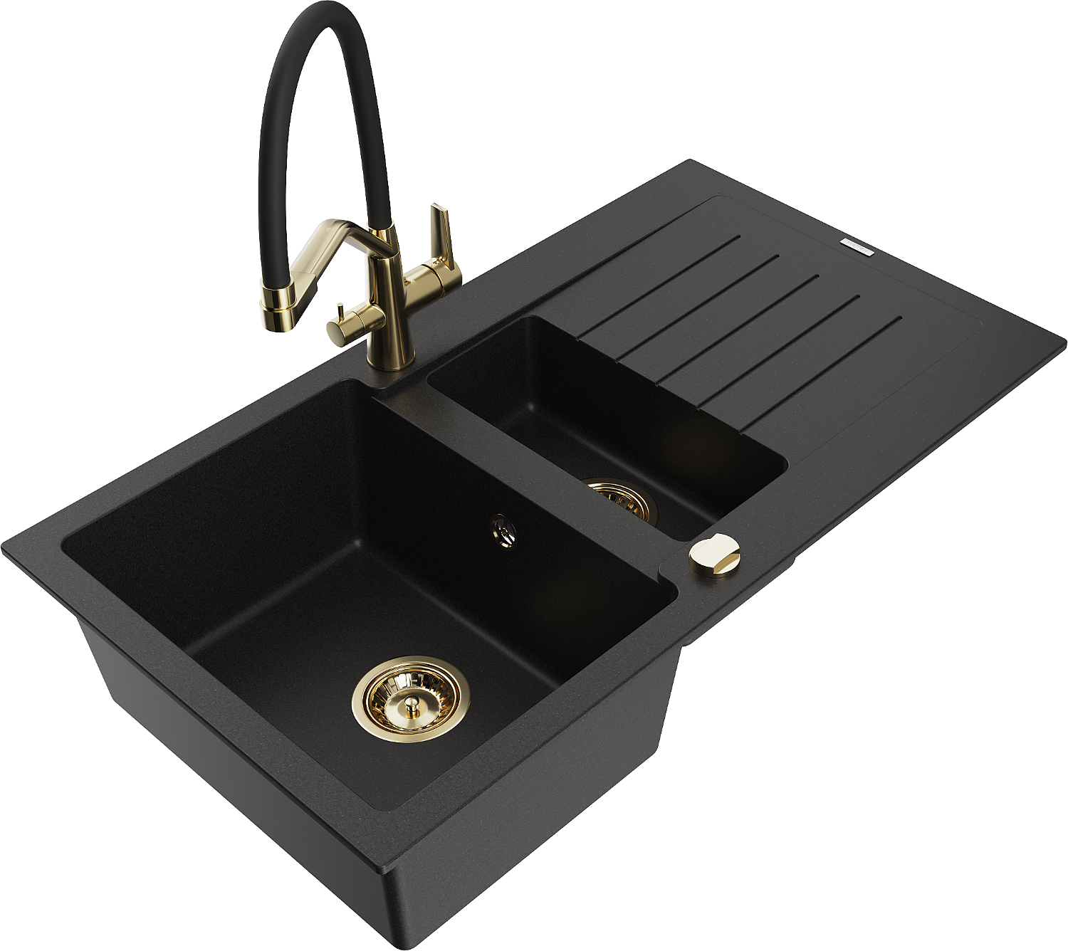 Mexen Matias žulový kuchynský drez 1,5-komorový s odkvapkávačom a kuchynskou batériou Duo, čierny - 6502-77-671701-57-G