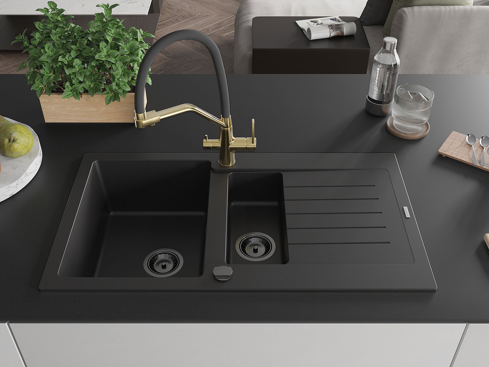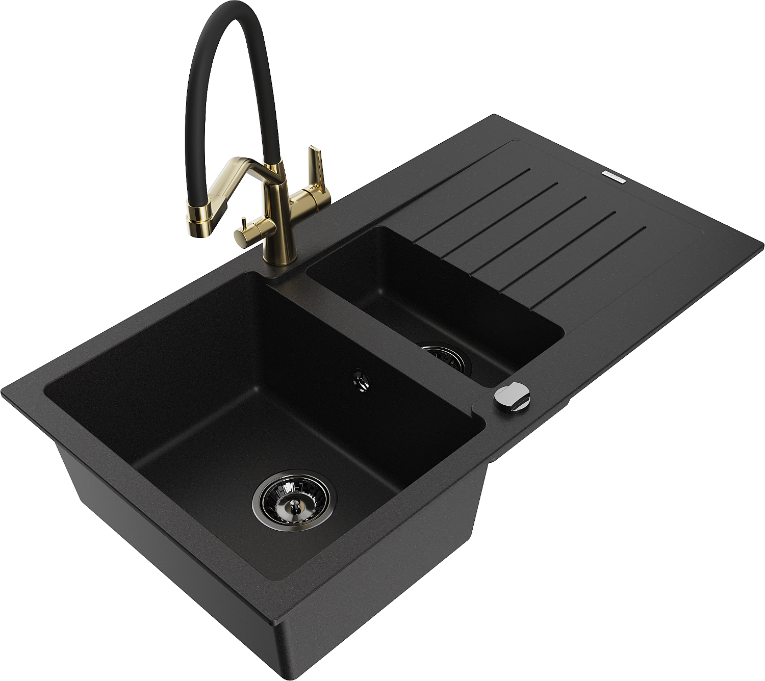 Mexen Matias žulový drez 1,5-komorový s odkvapkávačom a kuchynskou batériou Duo, čierny - 6502-77-671701-57-B