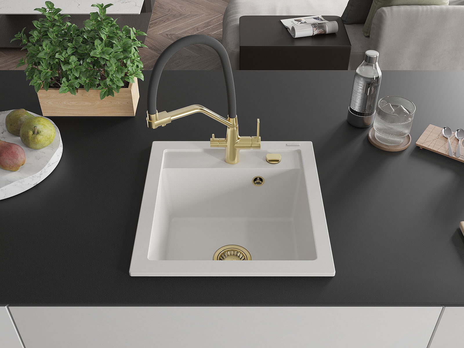 Mexen Vito žulový drez s 1 komorou a kuchynskou batériou Duo, biely - 6503-20-671701-57-G