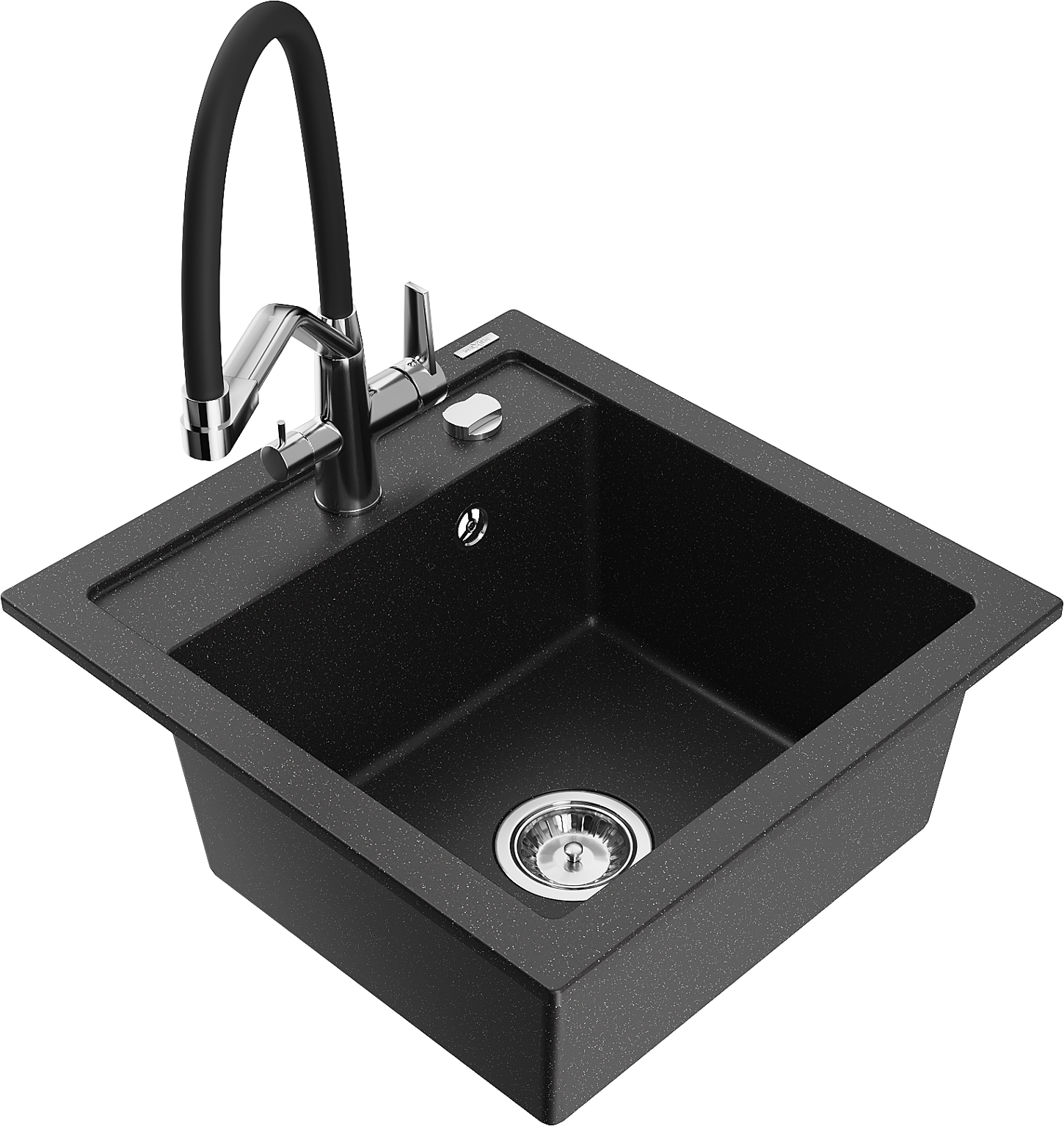 Mexen Vito granitový drez s 1 komorou a kuchynskou batériou Duo, čierno/strieborný metalik - 6503-73-671701-07