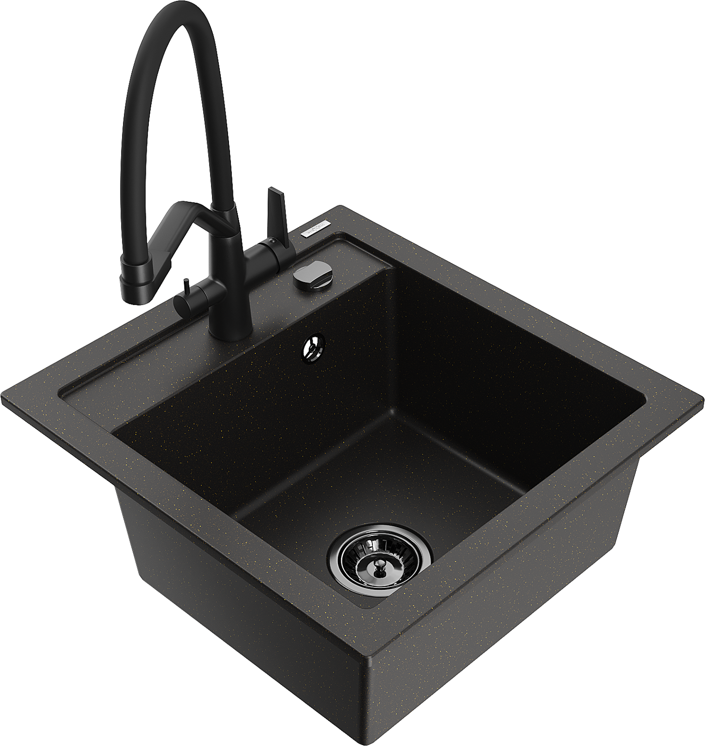 Mexen Vito kuchynský granitový drez 1-komorový s kuchynskou batériou Duo, čierny/zlatý metalik - 6503-75-671701-70-B