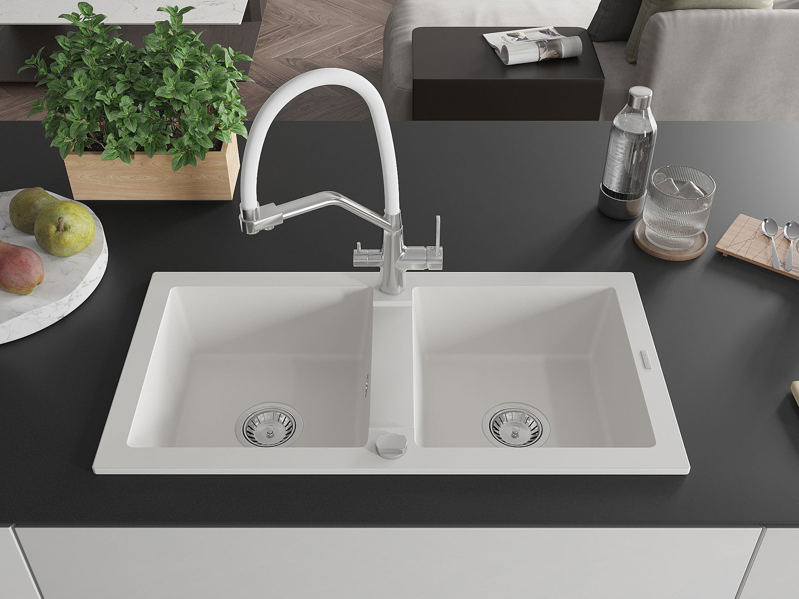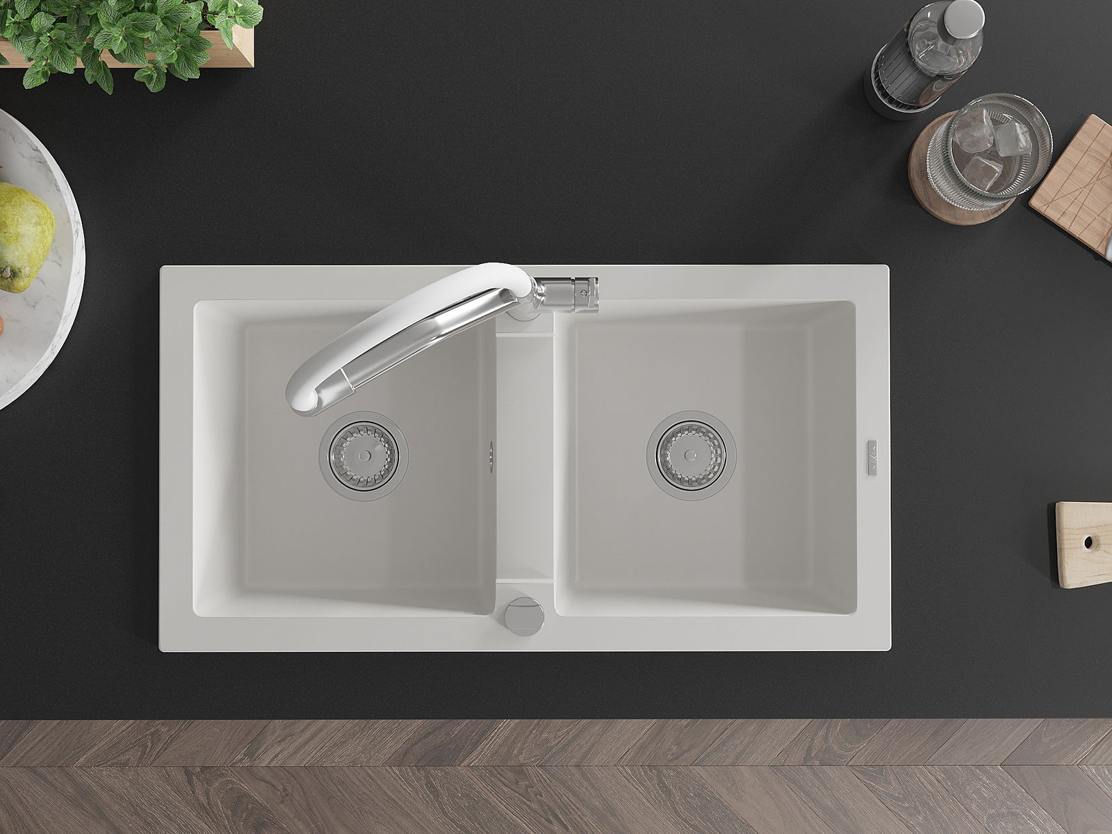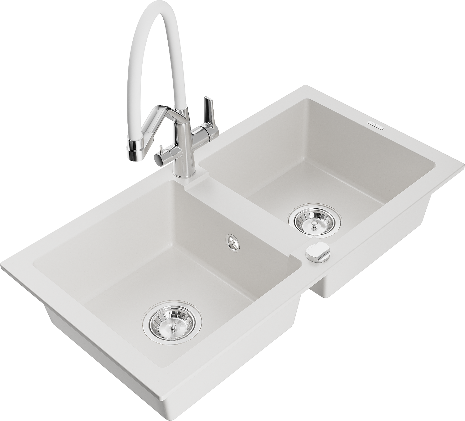 Mexen Mario granitový kuchynský drez 2-komorový s kuchynskou batériou Duo, biely - 6504-20-671701-02