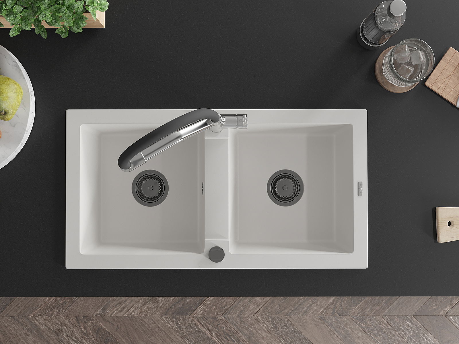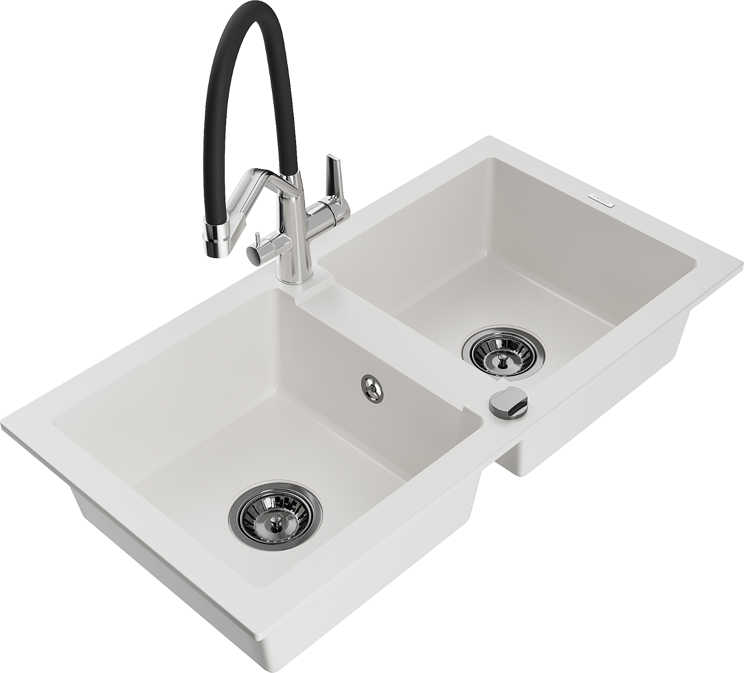 Mexen Mario granitový drez 2-komorový s kuchynskou batériou Duo, biely - 6504-20-671701-07-B