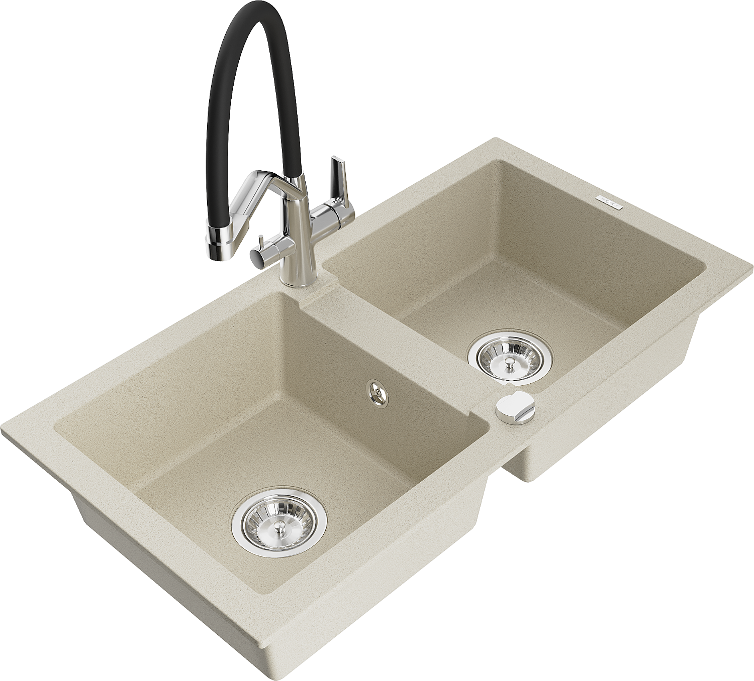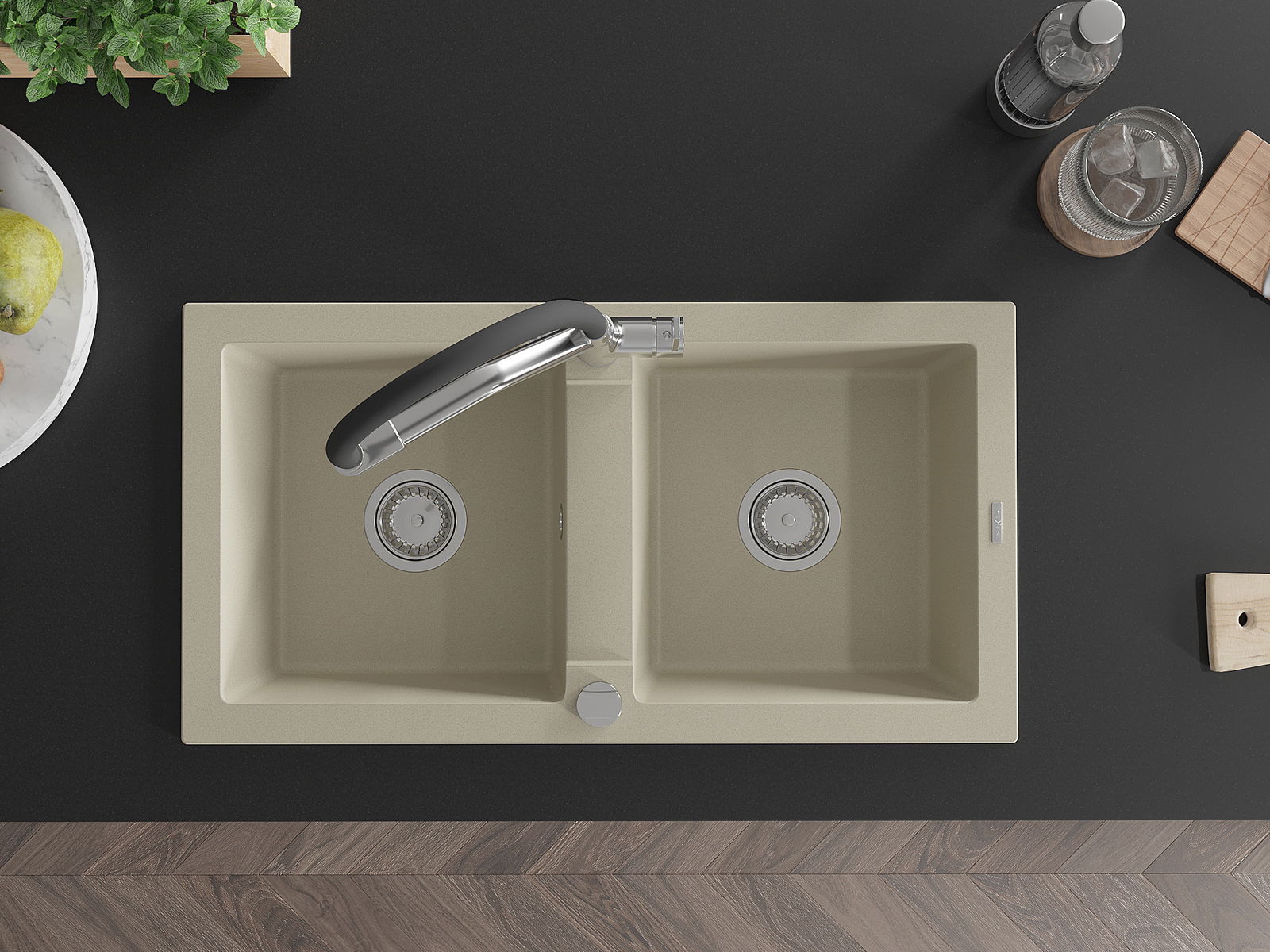 Mexen Mario žulový drez dvojkomorový s kuchynskou batériou Duo, béžový - 6504-69-671701-07