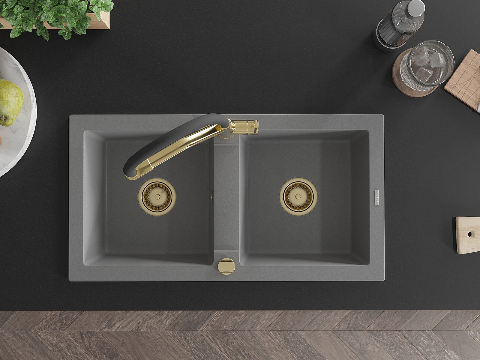 Mexen Mario žulový dvojkomorový drez so samostatnou kuchynskou batériou Duo, sivý - 6504-71-671701-57-G
