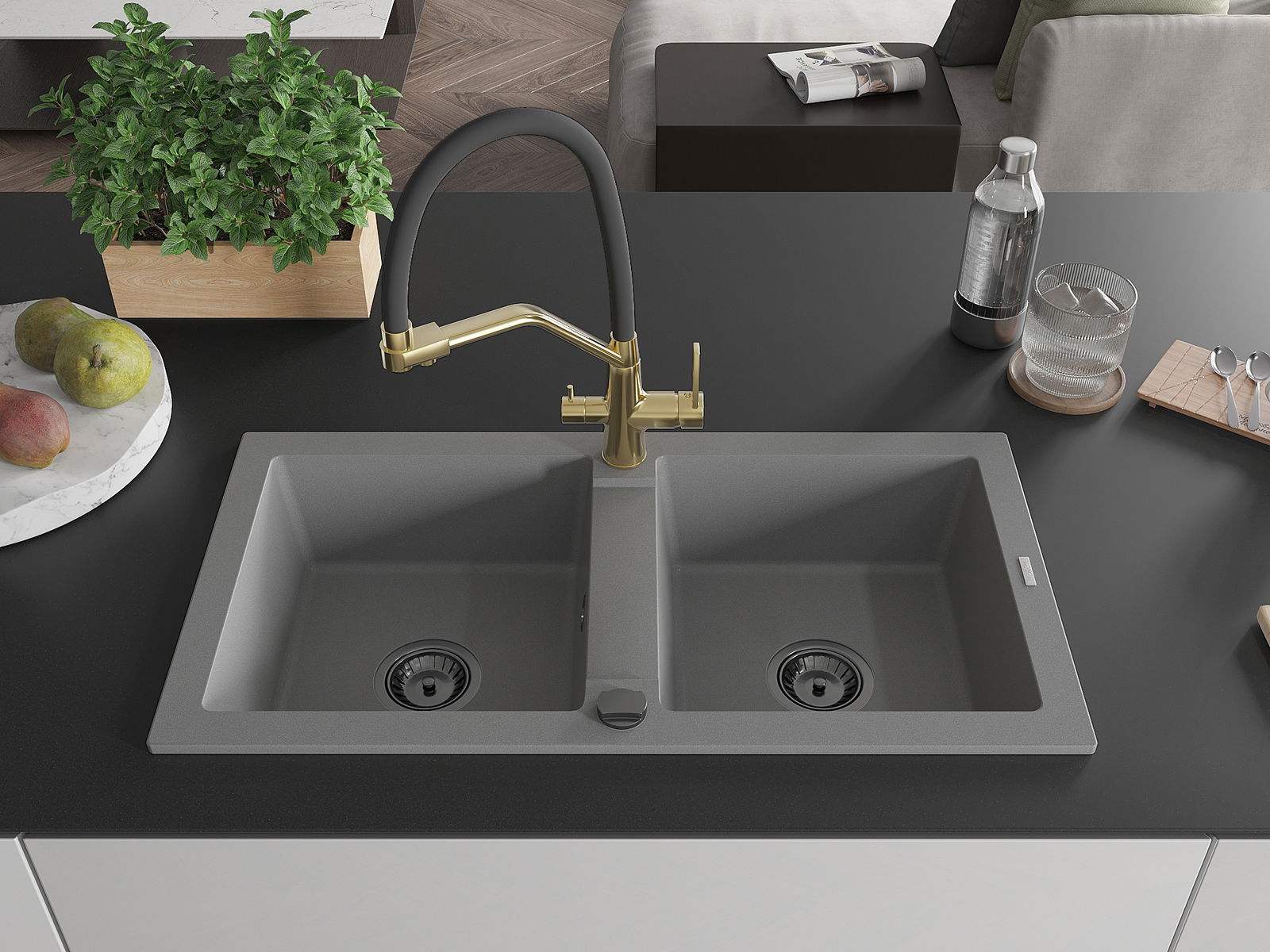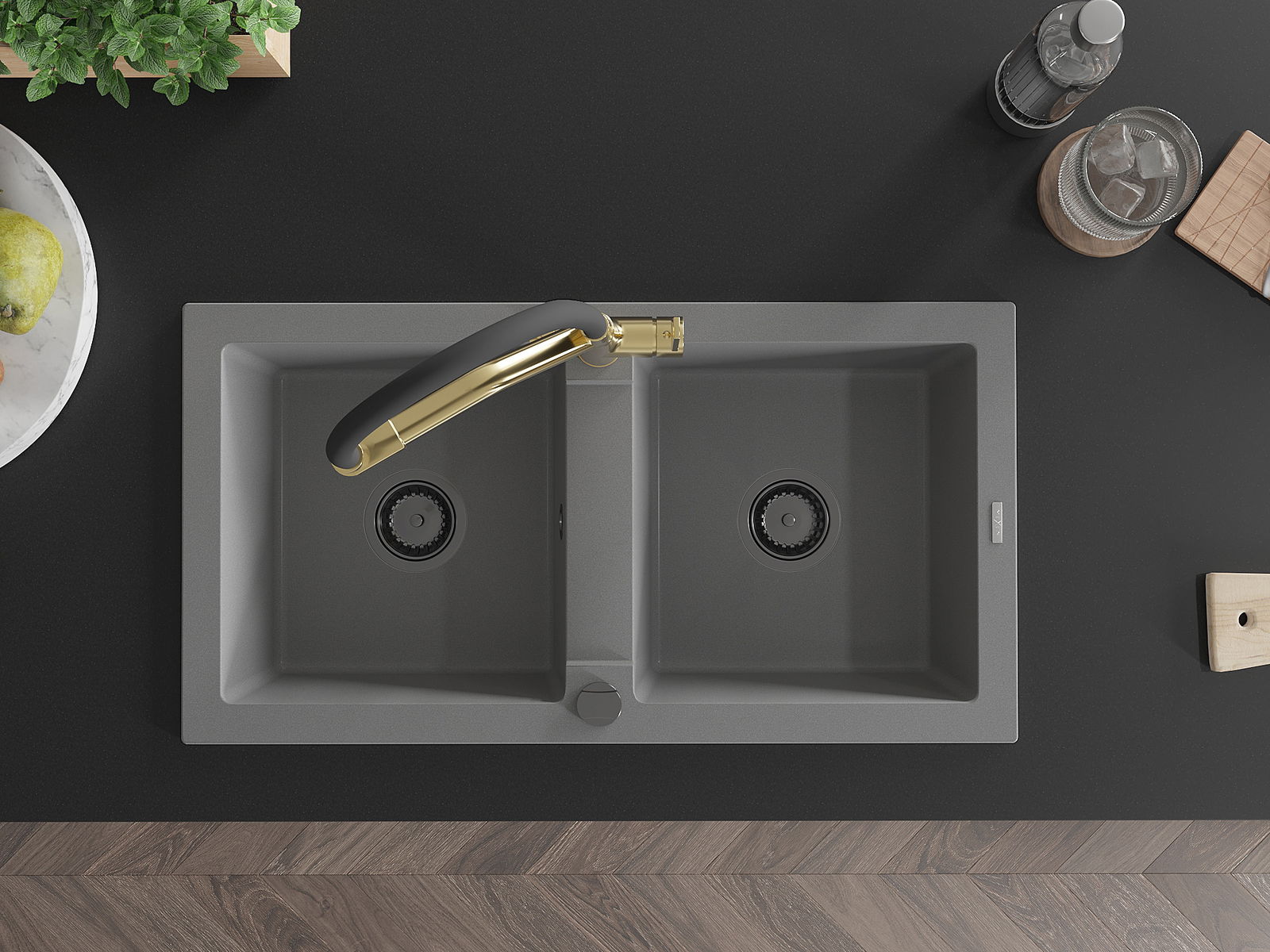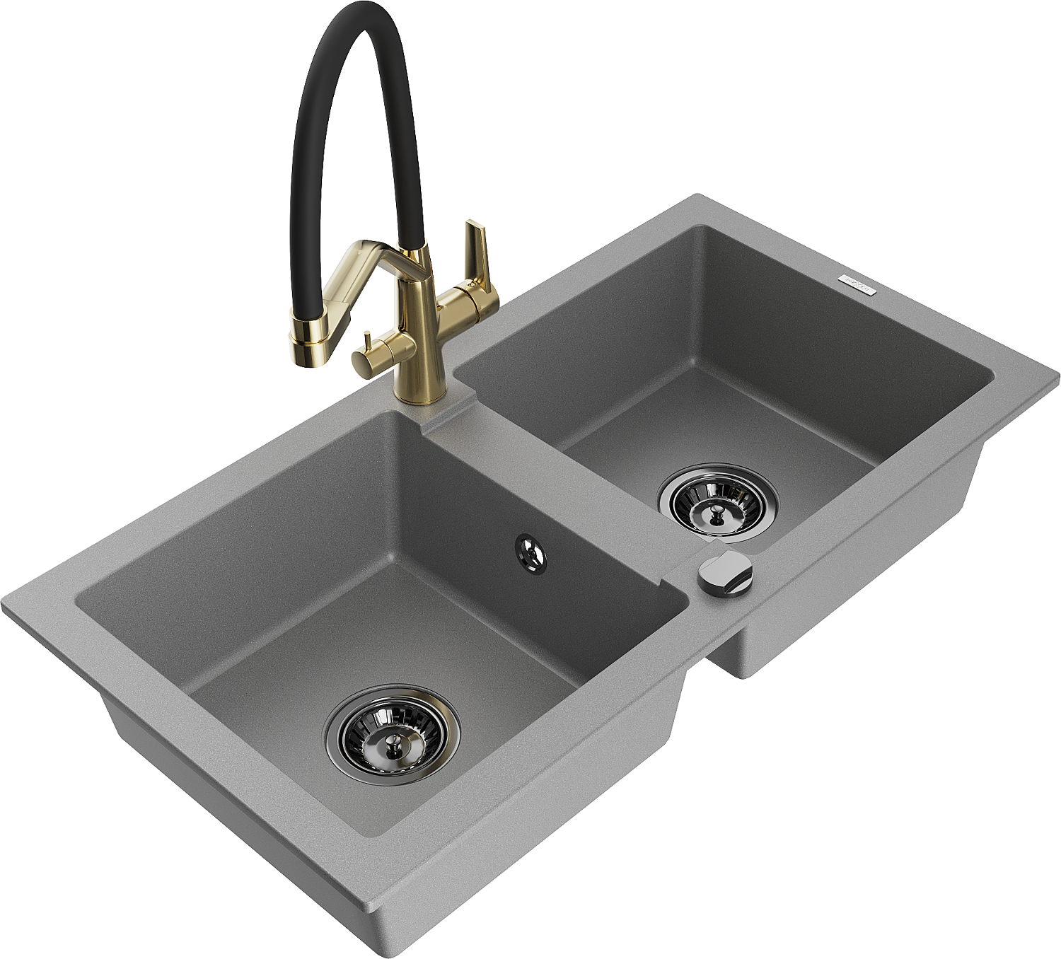 Mexen Mario granitový drez 2-komorový s kuchynskou batériou Duo, sivý - 6504-71-671701-57-B