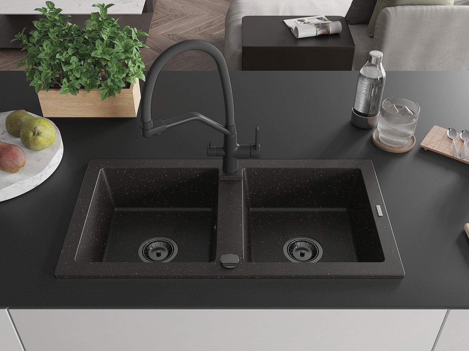 Mexen Mario dvojkomorový granitový drez s kuchynskou batériou Duo, čierny/zlatý metalik - 6504-75-671701-70-B
