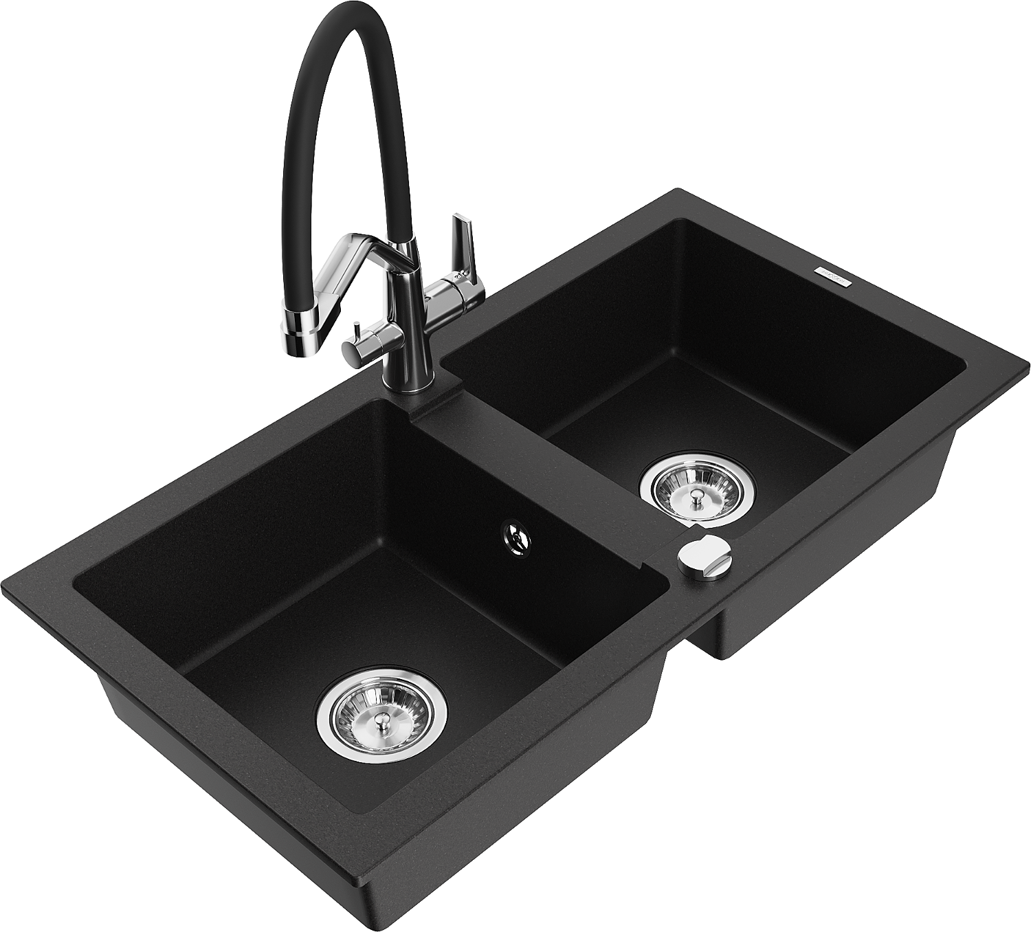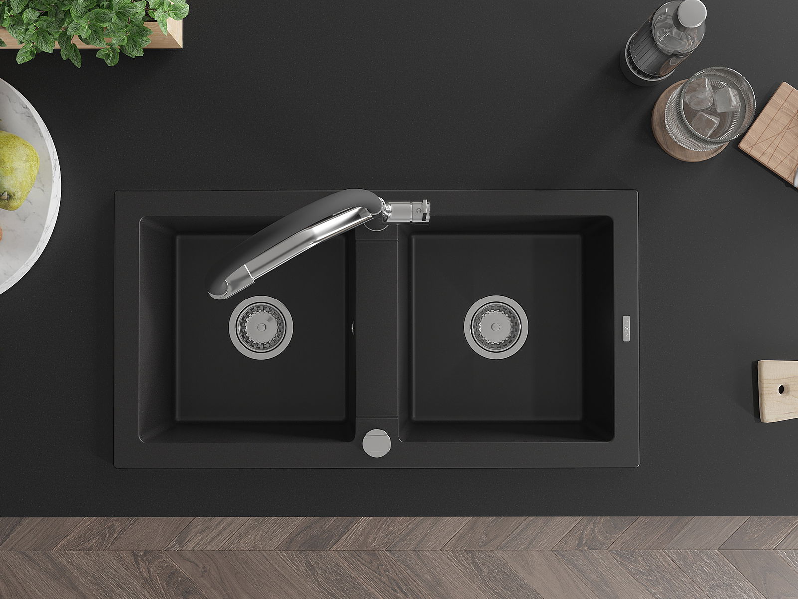 Mexen Mario granitový drez 2-komorový s kuchynskou batériou Duo, čierny - 6504-77-671701-07