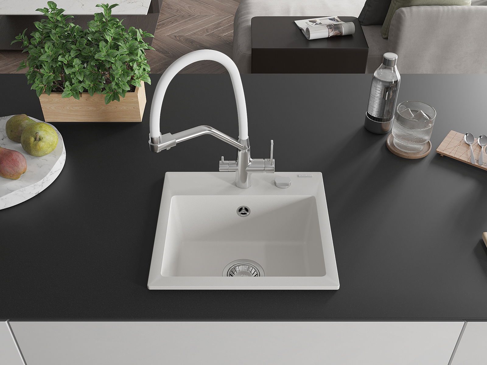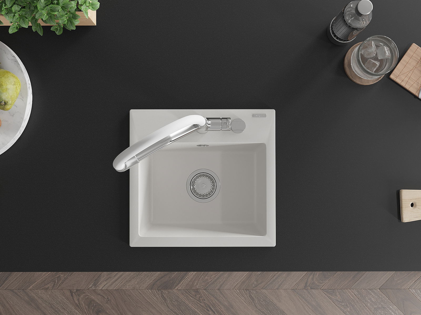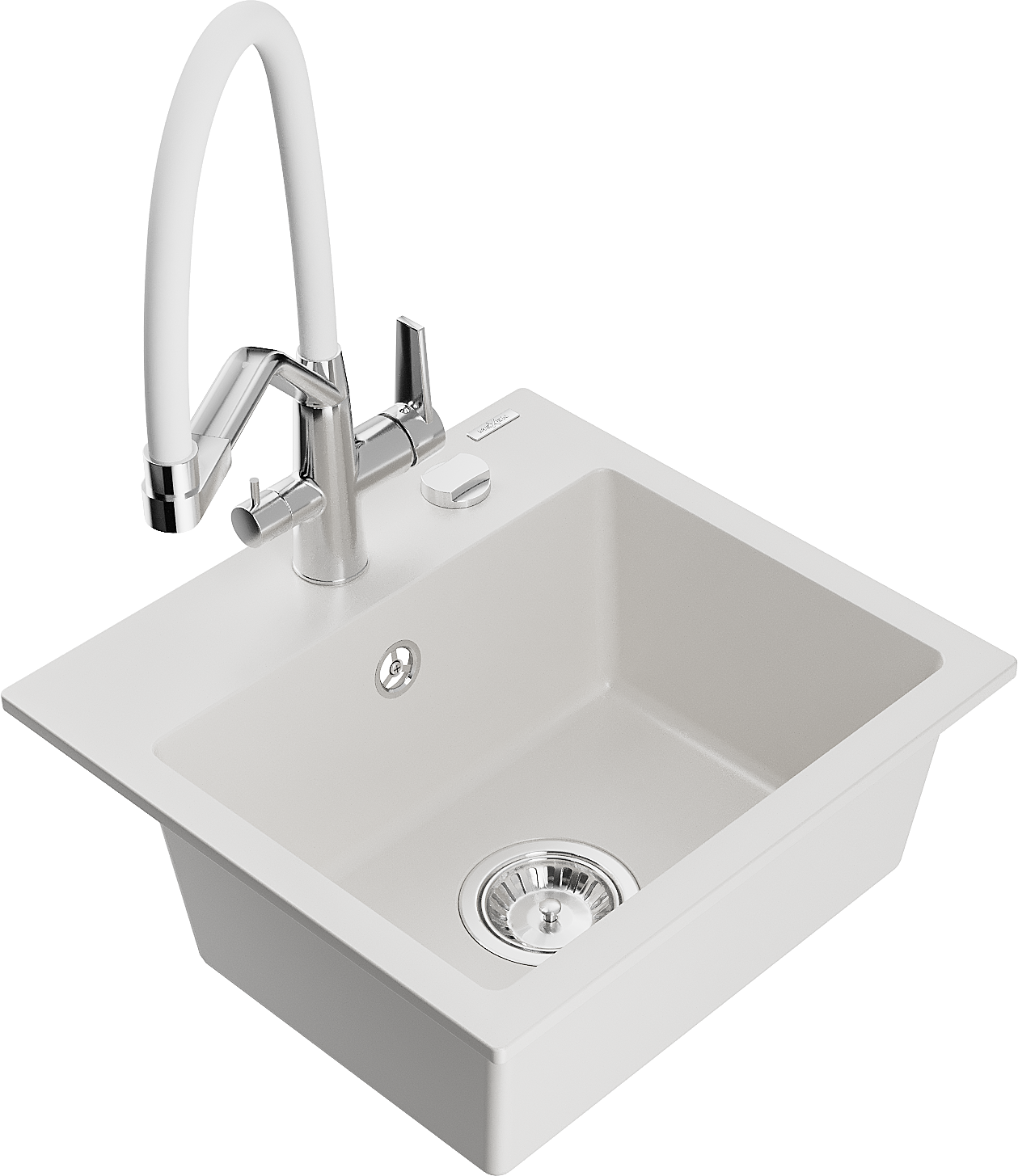 Mexen Milo granitový drez 1-komorový s kuchynskou batériou Duo, biela - 6505-20-671701-02