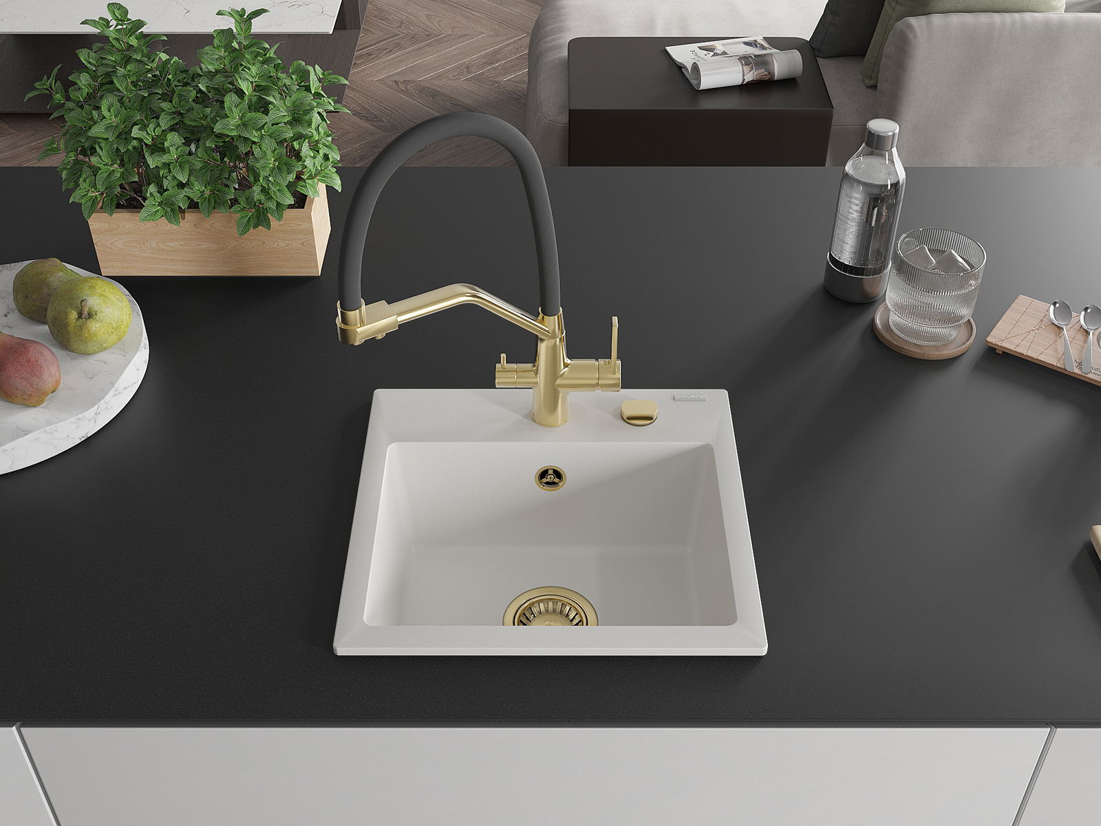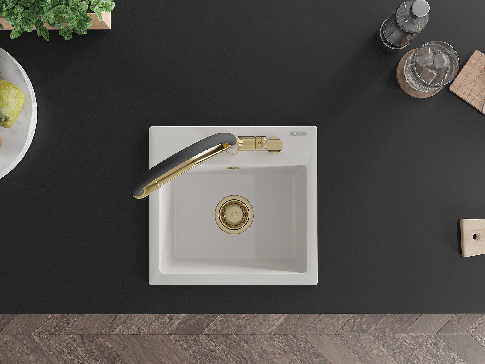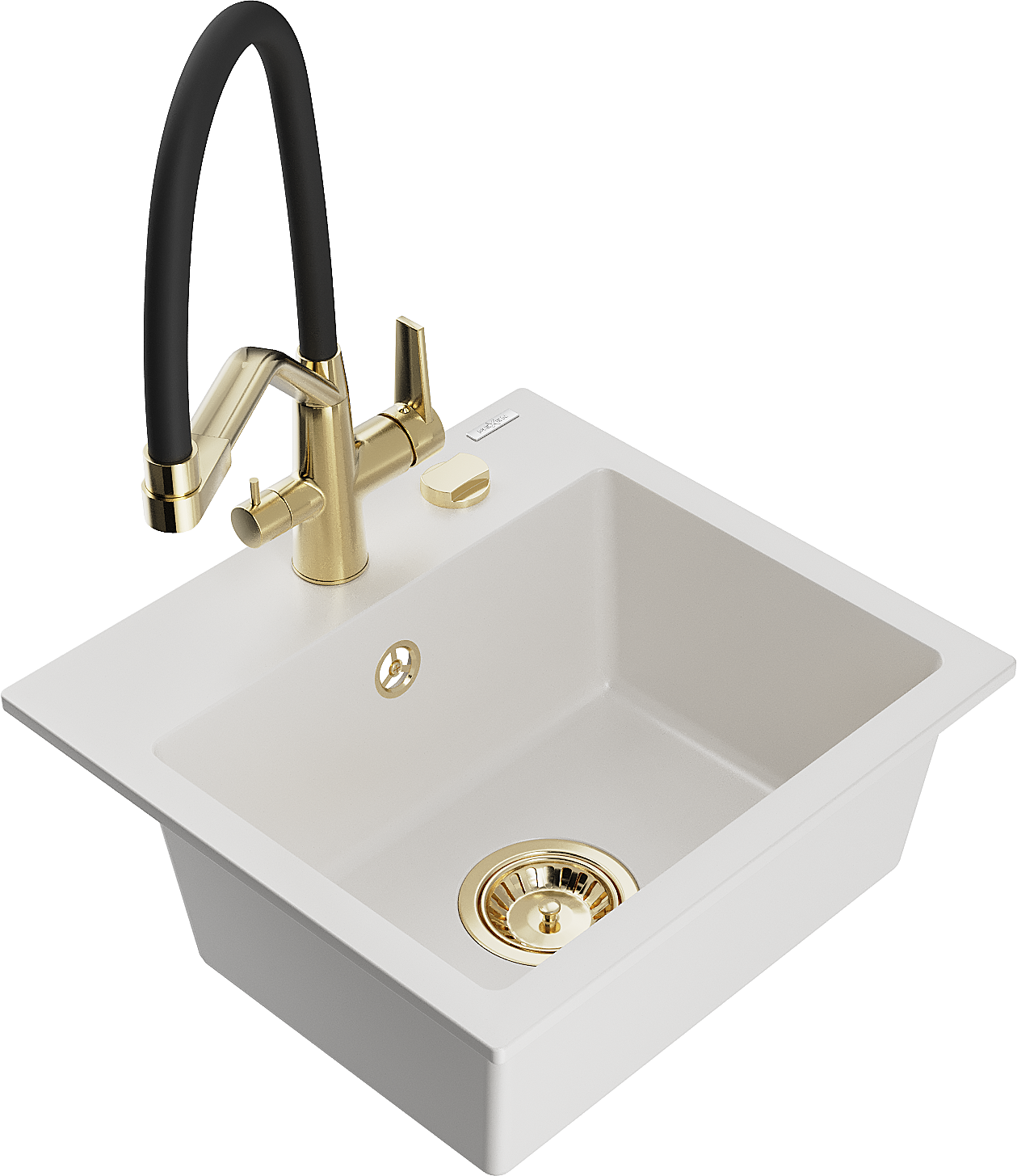 Mexen Milo granitový kuchynský drez s 1 komorou a kuchynskou batériou Duo, biely - 6505-20-671701-57-G
